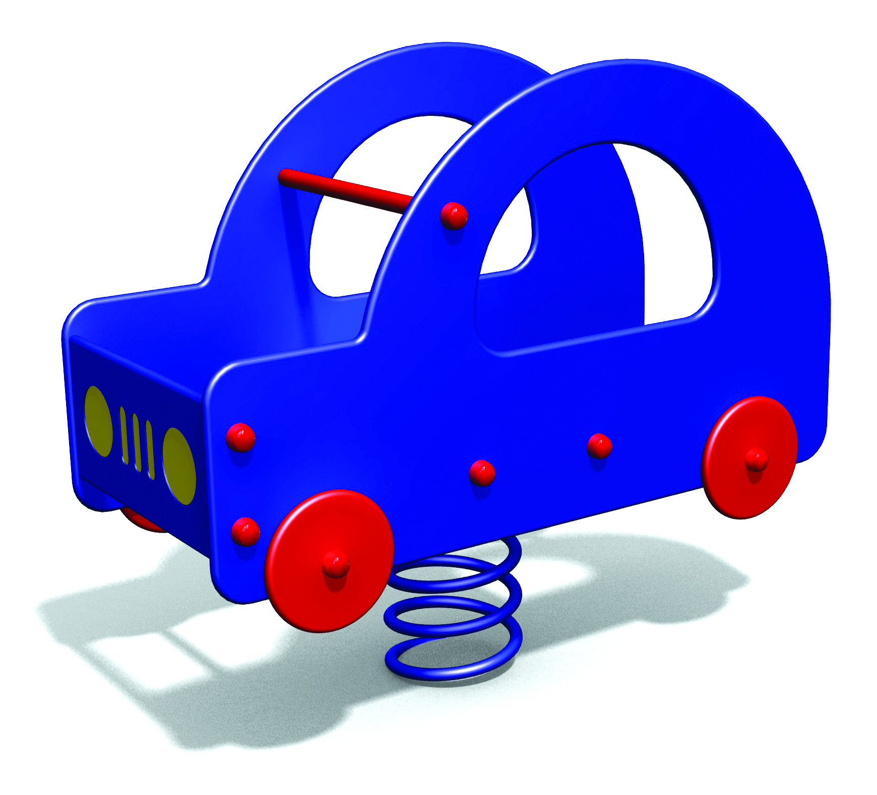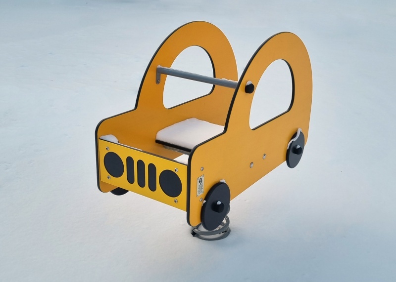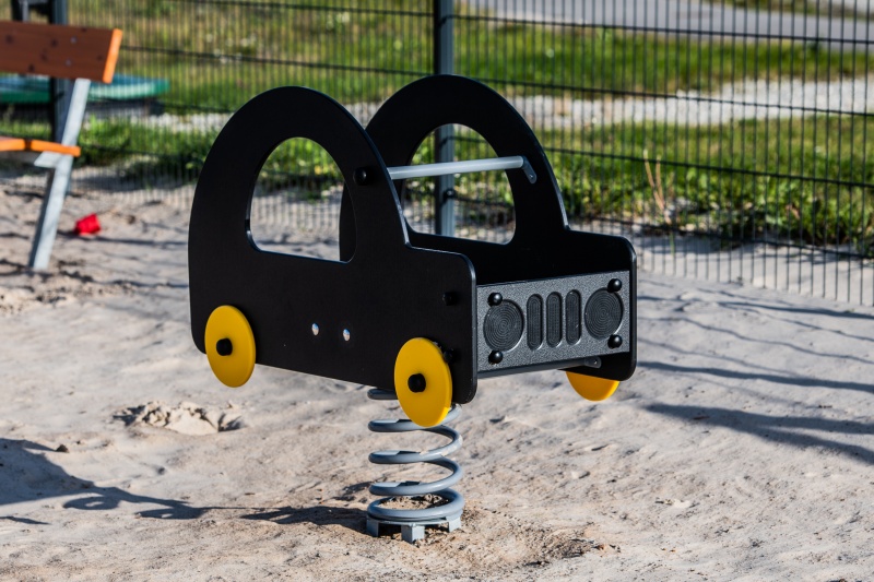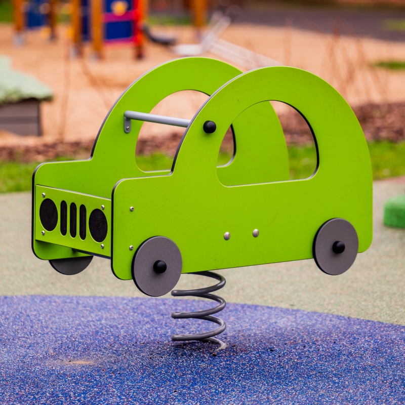 Bilformad fjädergunga som lockar till rollekar och rörelse.