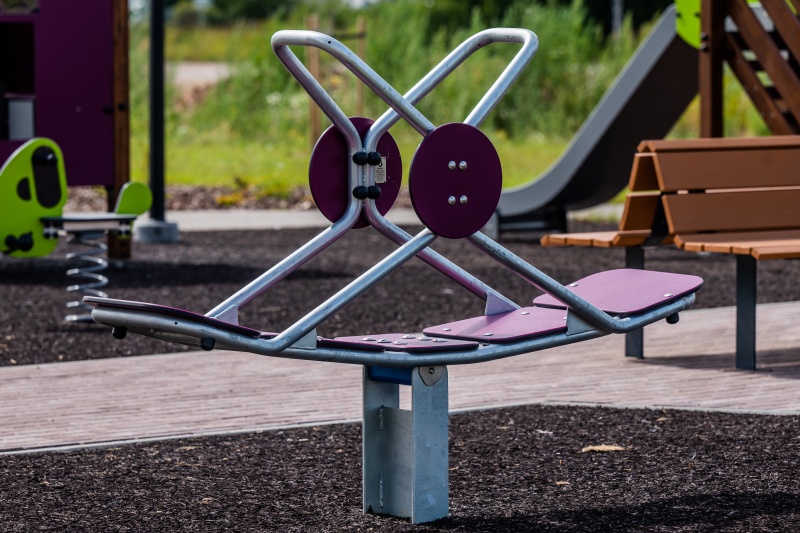 Stand-up see-saw accommodates two standing kids at a time. It promotes cooperation, helps develop coordination and strength and improves overall fitness.