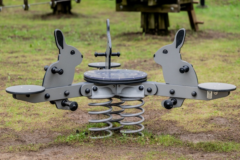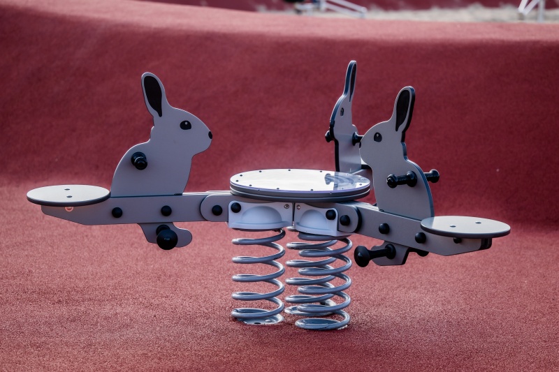 Fjädergunga i FARMLIFE-serien med kanintema för trygg och social rörelselek i offentlig miljö.