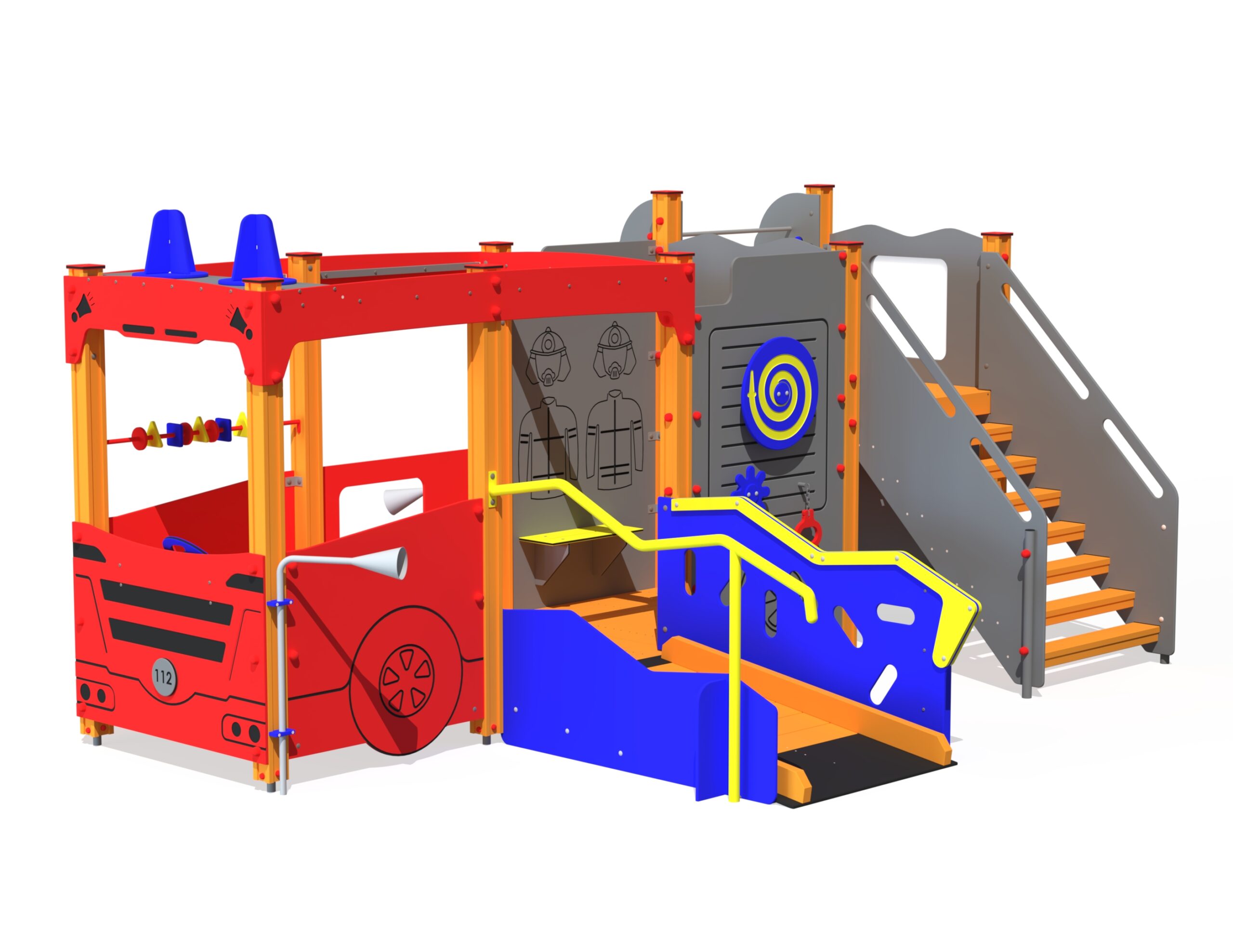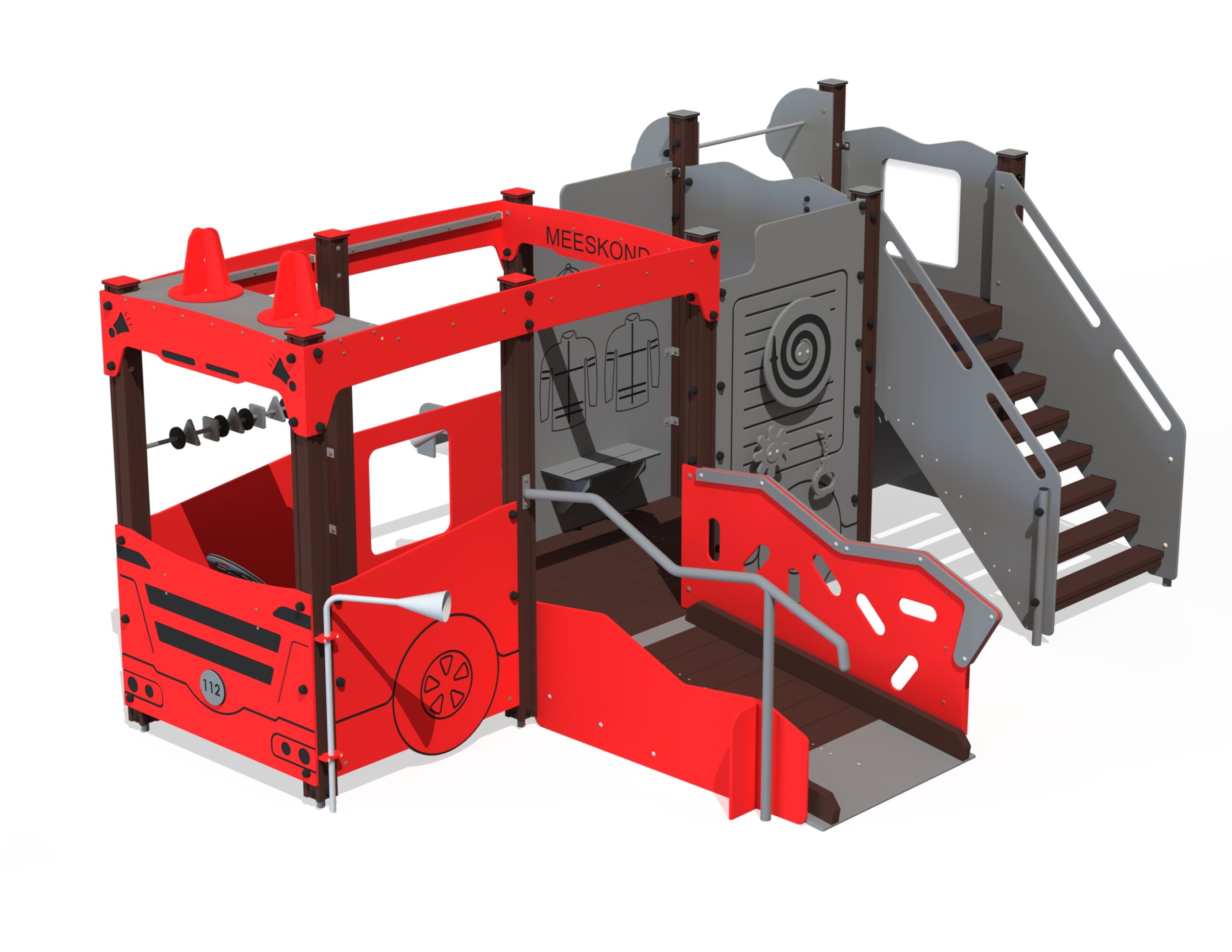 Brandbil stor är en omfattande temalekutrustning som rymmer ett helt brandmansteam. Fordonet har en förarhytt med ratt framtill och två sittplatser baktill. Upp- och nedstigning sker via trappa med ledstänger eller rullstolsanpassad ramp, och nedfärd sker via en bred rutschkana med höjd 1,2 m. Brandbilen är även utrustad med stegformad klättervägg och genomkrypningshål. Lekvärdet förstärks av realistiska detaljer som två roterande brandsirener, två roterande växlar, en roterande brandslang, ett handtag med kedja samt två sammankopplade talrör, vilket gör leken engagerande och samarbetsinriktad.