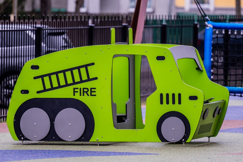 Denna roliga brandbil rymmer en hel besättning. Framsidan har förarhytt med ratt, växelspak och bänkar, medan bakdelen är utrustad med långa bänkar. Brandbilen kan nås via sidodörr eller genom krypöppning baktill, vilket ger flera sätt att ta sig in och ut.
