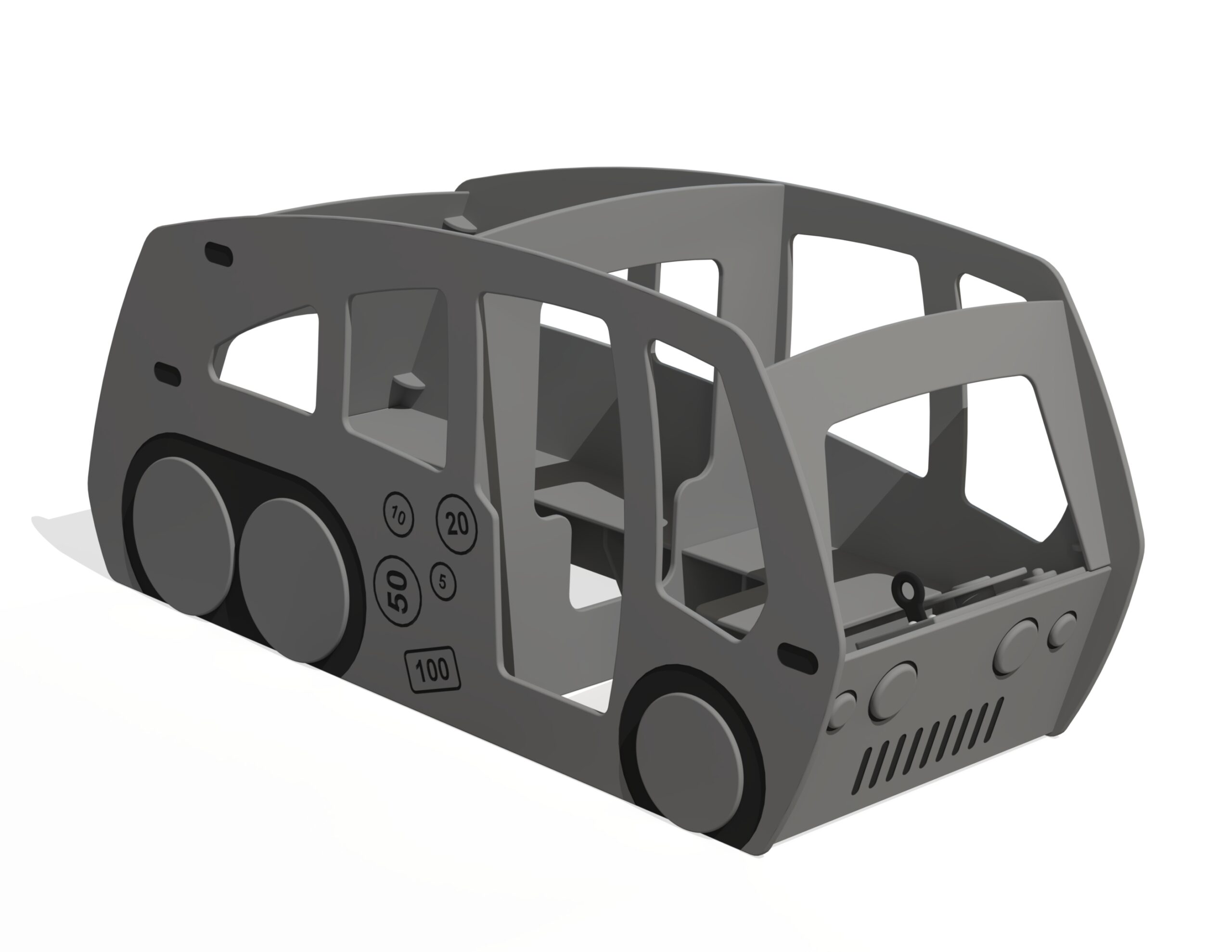 Bussen är utrustad med förarsäte, ratt, växelspak och bänkar framtill samt långa passagerarsäten baktill. Barn kan ta sig in via sidodörr eller genom krypöppning bak. Biljettpriset visas på dörren och bestäms av resans längd.