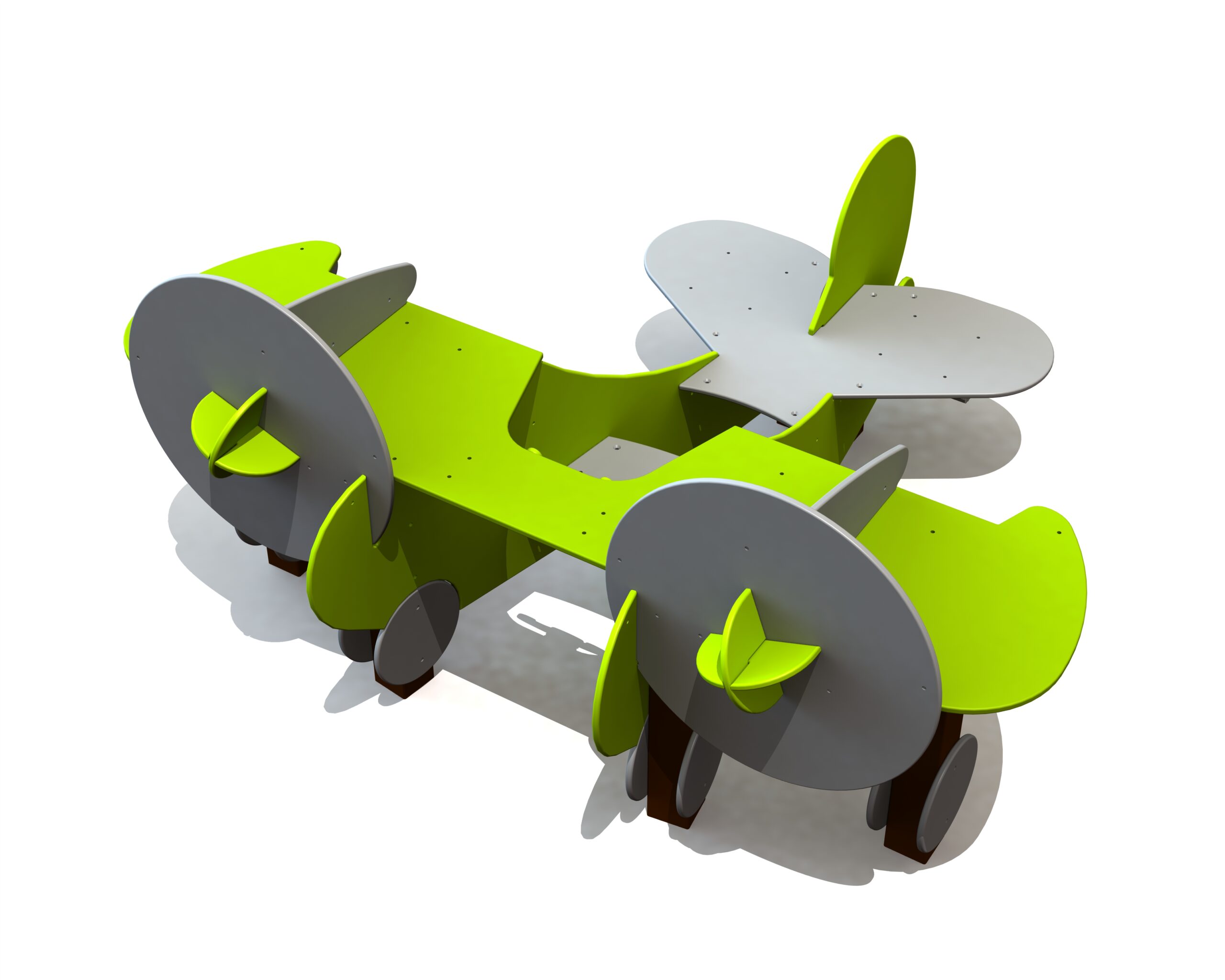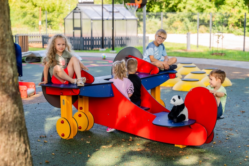 Ett roligt flygplan med propellrar där barn kan sitta i cockpit, leka pilot och sväva över fantasivärldens höjder. Konstruktionen stimulerar fantasi, rörelse och gemensam lek.