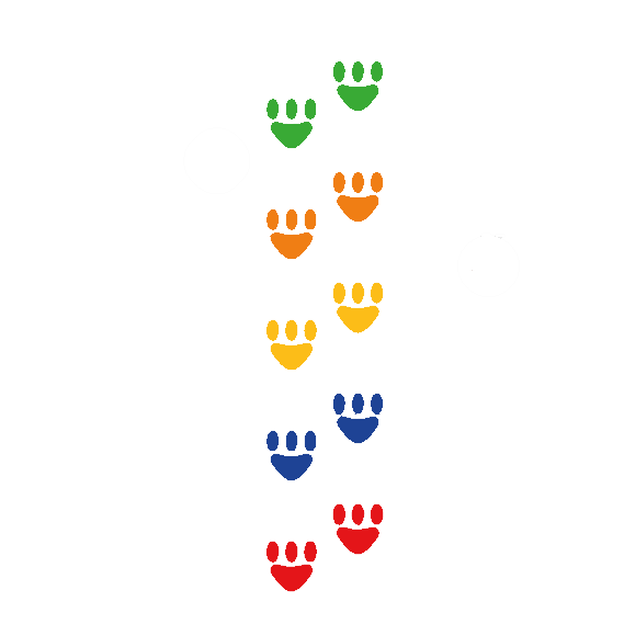 Fem par björnfotavtryck i samma färg. Välj mellan röd, gul, blå eller grön. Varje fot levereras på ett enskilt ark, vilket gör att de kan placeras fritt och anpassas efter yta, lek eller pedagogiskt upplägg.