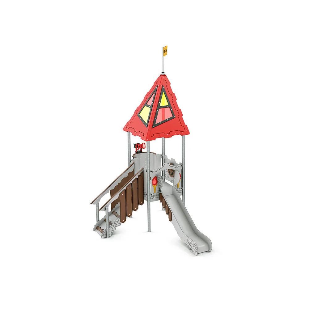 Galahad är en kompakt lekmiljö som väcker barns fantasi genom detaljer som fartygshjul, teleskop och dekorativa element. De halkfria stegen ger säker åtkomst till plattformen, varifrån barnen kan åka nerför rutschkanan. Lekställningen tränar balans, motorik och förståelse för orsak och verkan, samtidigt som den inspirerar till rollspel.