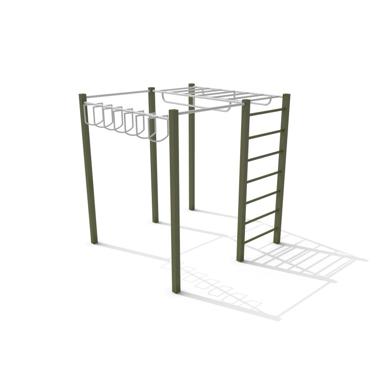Gymnastikset för tonåringar och vuxna bestående av två horisontella stänger, en vertikal stege, en horisontell stege med handtag och en horisontell stång med handtag. Konstruktionen är tillverkad av galvaniserat och pulverlackerat stål. Träningen stärker muskler i bröst, rygg, armar, axlar och mage samt förbättrar balans och motorisk koordination.