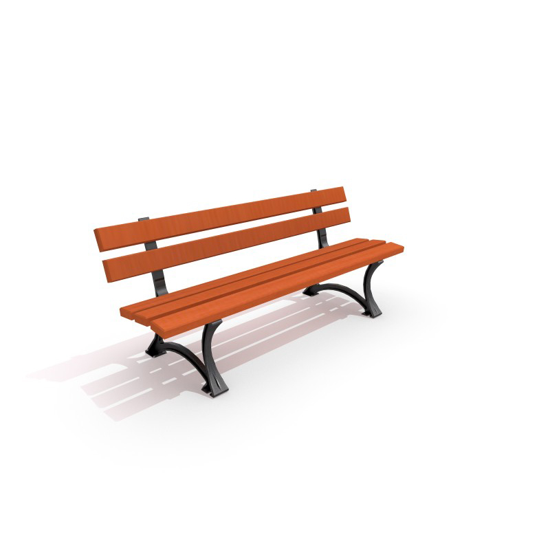Gjutjärnsbänk med ryggstöd utan armstöd. Sits och ryggstöd av trä. Bänken behåller eleganta och estetiska utseende av urbana möbler genom välvda stålformer i hand med trä.