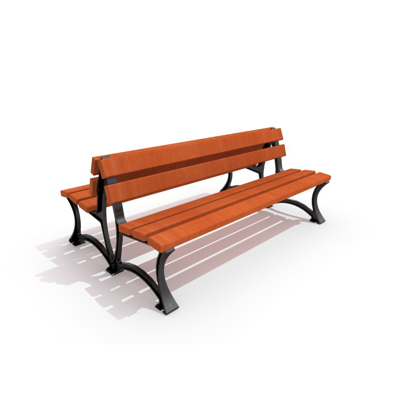 Dubbel gjutjärnsbänk med ryggstöd utan armstöd. Sits och ryggstöd av trä. Bänken behåller eleganta och estetiska utseende av urbana möbler genom välvda stålformer i hand med trä.