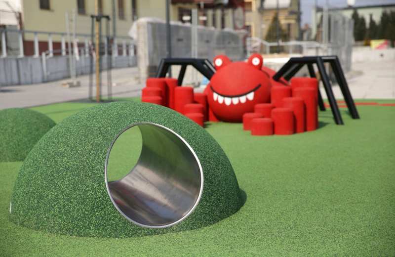 Hållbar 3D-figur gjord av färgat EPDM-granulat och pulverlackerade metalldelar. Fästs på asfalt eller betong med ankarfästen.
