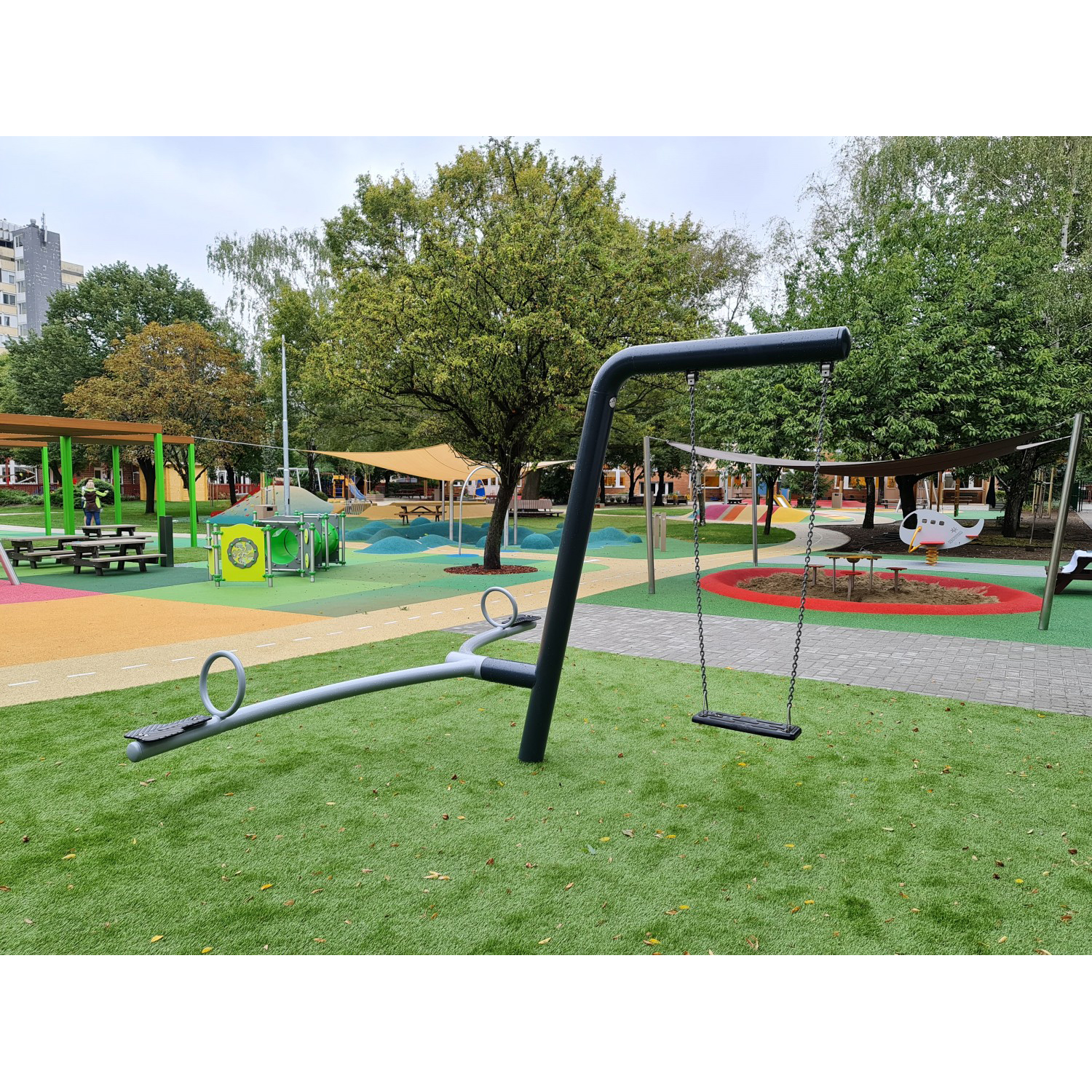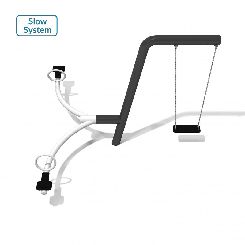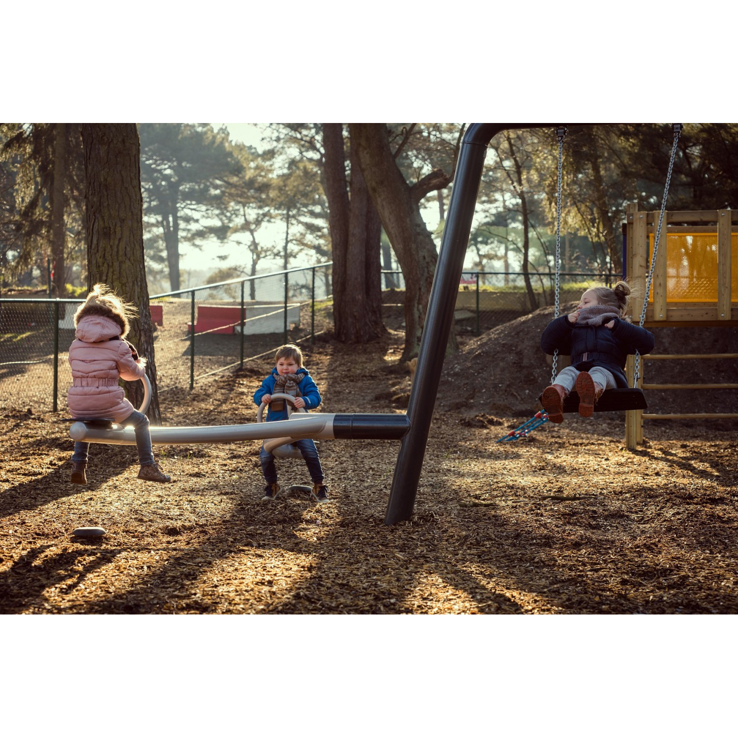 BANTIS är en unik lekenhet som kombinerar en klassisk gunga för en person med en gungbräda för två personer. Gungbrädan är utrustad med ett integrerat ”Slow System” som bromsar rörelsen och ger ökad säkerhet. Konstruktionen har en modern färgsättning i grått och grafit med svarta säten och passar väl i offentliga lekmiljöer.