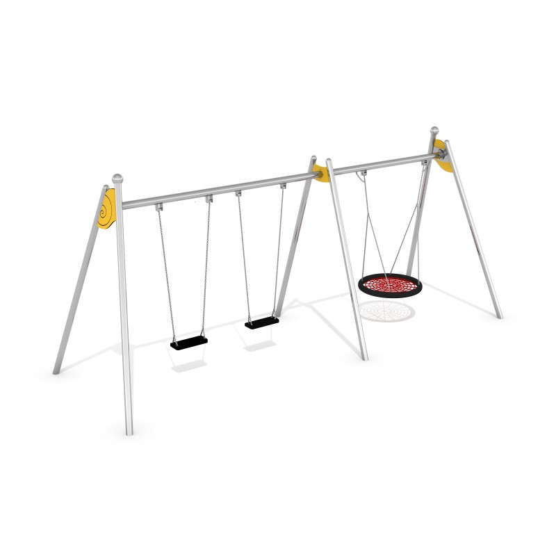 KOMBINO 1 är en trippelgunga med två platta säten och en fågelbosits upphängda i kedjor. Den rostfria stålkonstruktionen är anpassad för väder och intensiv användning. Designen kompletteras med snigelinspirerade dekorativa detaljer. Finns även i galvaniserad och pulverlackerad version.