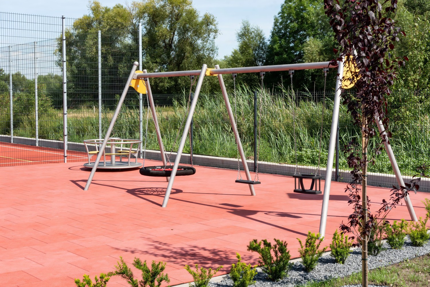 KOMBINO 3 är en trippelgunga med tre olika sittalternativ: platt sits, babyboxsits och fågelbosits. Konstruktionen är gjord av rostfritt stål och har dekorativa snigelinspirerade avslut. Gungan möjliggör lek för barn i olika åldrar samtidigt. Finns även i galvaniserad och pulverlackerad version.