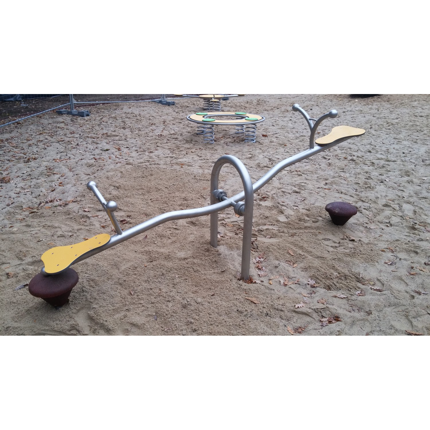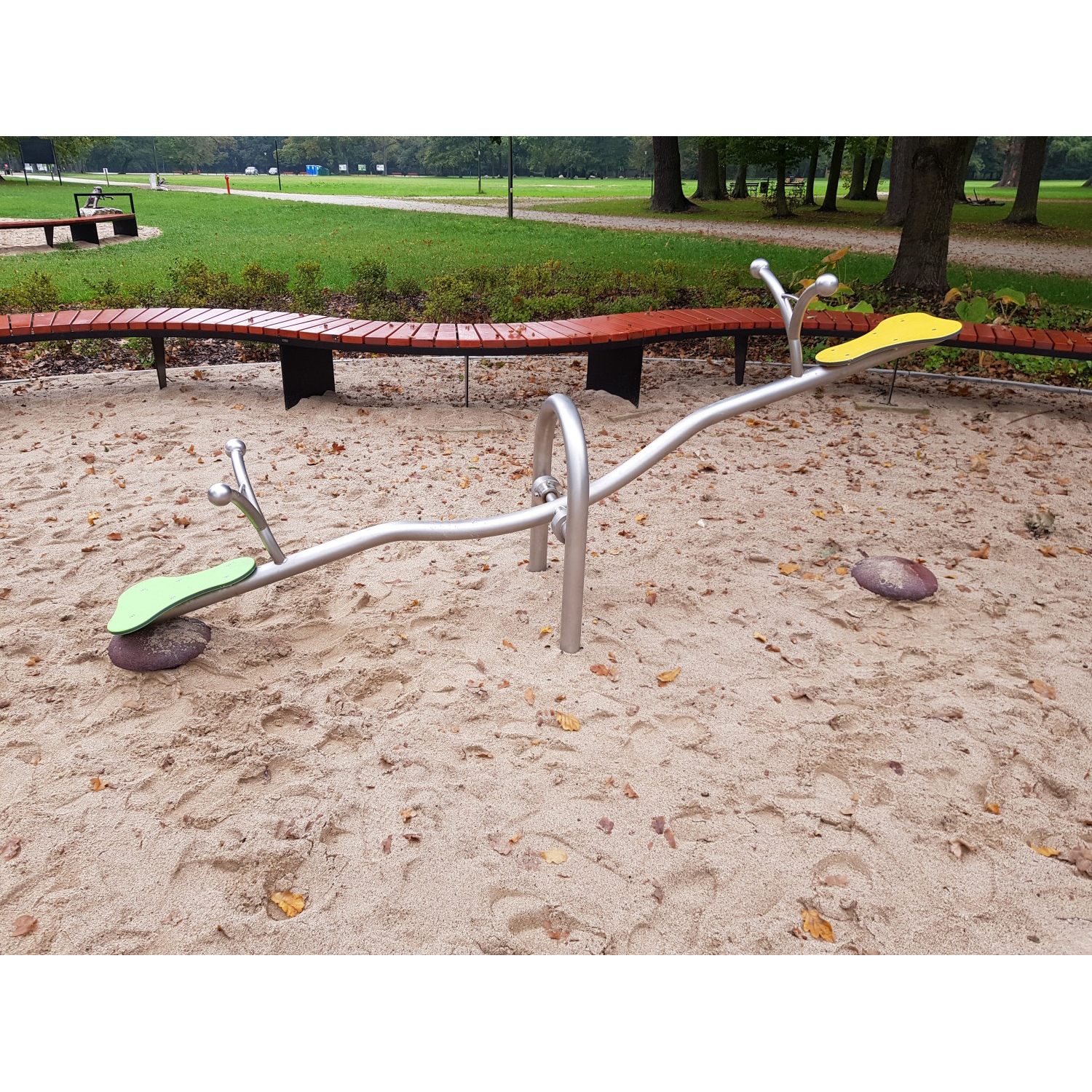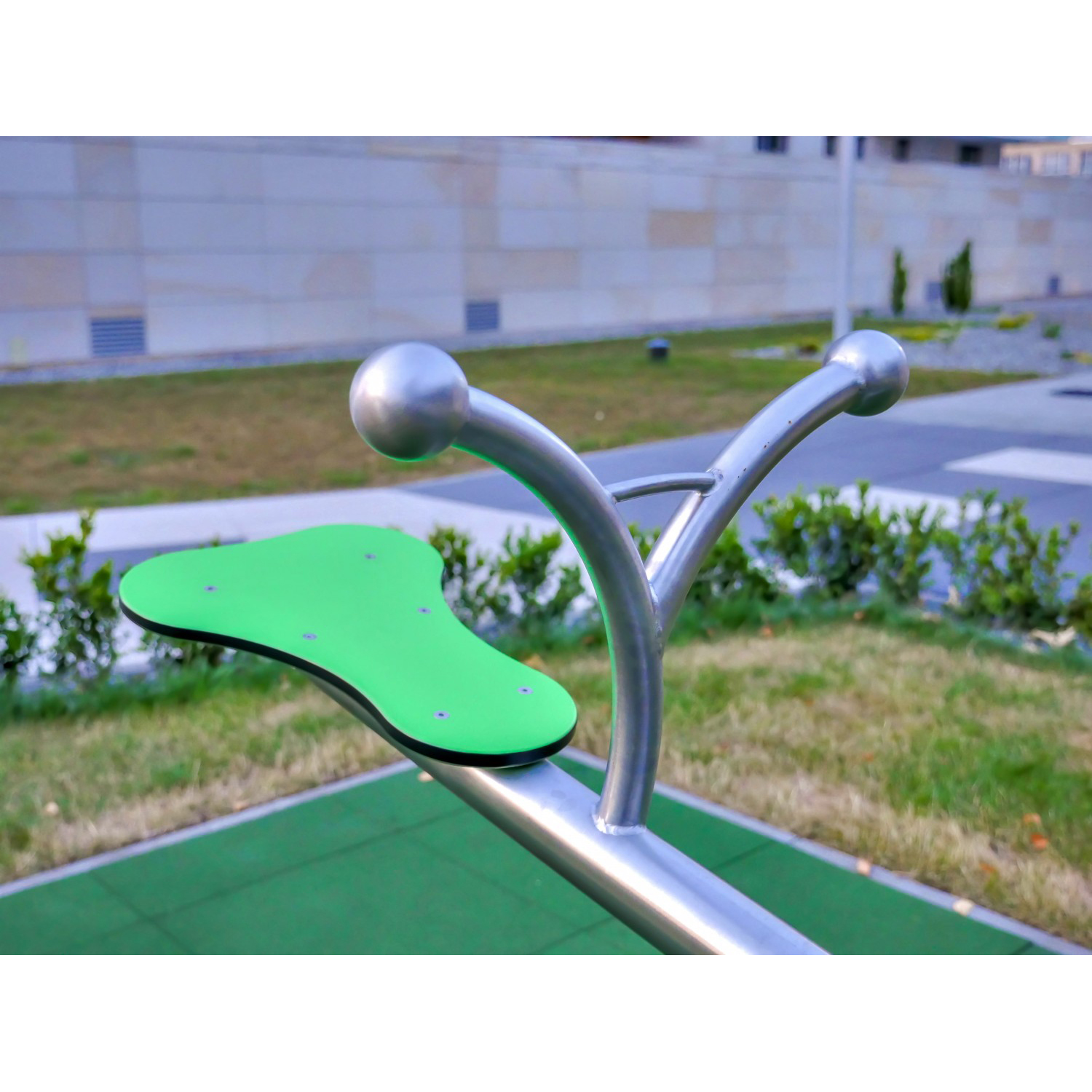 BALANCILO 1 är en lekplatsgungbräda med två säten och handtag utan ryggstöd. Den snigelinspirerade designen kombineras med en robust konstruktion i rostfritt stål. Gungrörelsen utvecklar balans och koordination i gemensam lek.