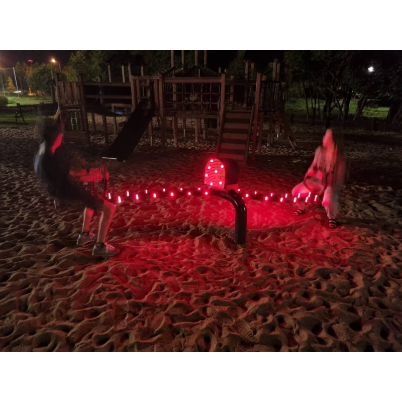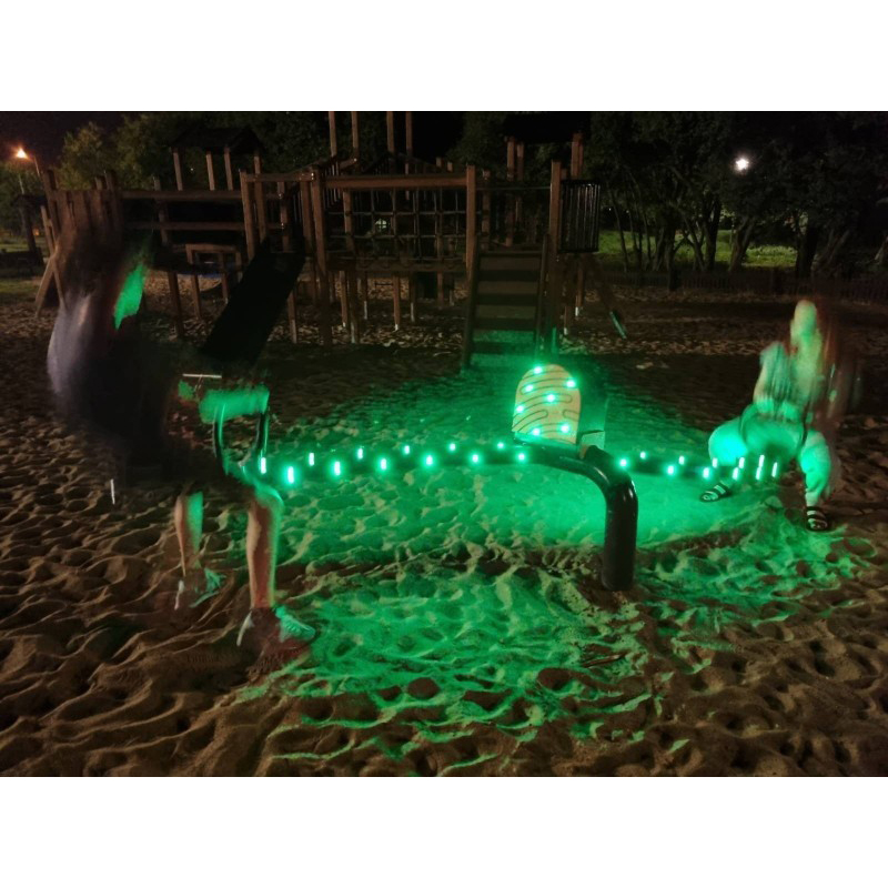 Interaktiv gungbräda med ljus och ljud som drivs av rörelse.