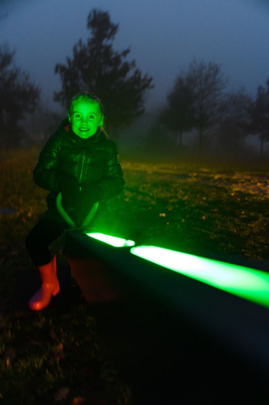 Interaktiv gungbräda som skapar ljus och ljud genom rörelse.