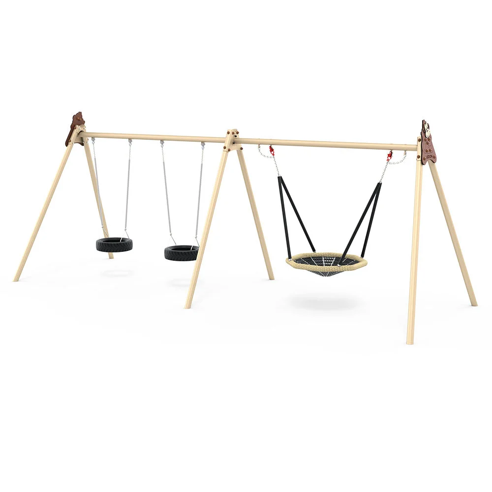 Målat modulärt gungstativ ur Explore-serien med två däckgungor och en fågelbogunga. Utformat för balans, social lek och avkoppling i en tematiserad miljö.