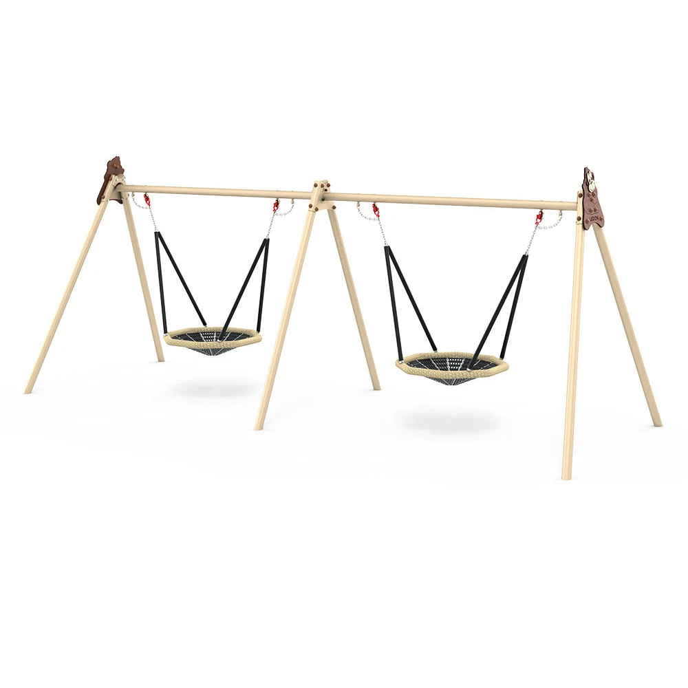 Målat gungstativ ur Explore-serien med modulär uppbyggnad och två fågelbogungor. Ger utrymme för både lugn gunglek och social samvaro i en tematiserad miljö.