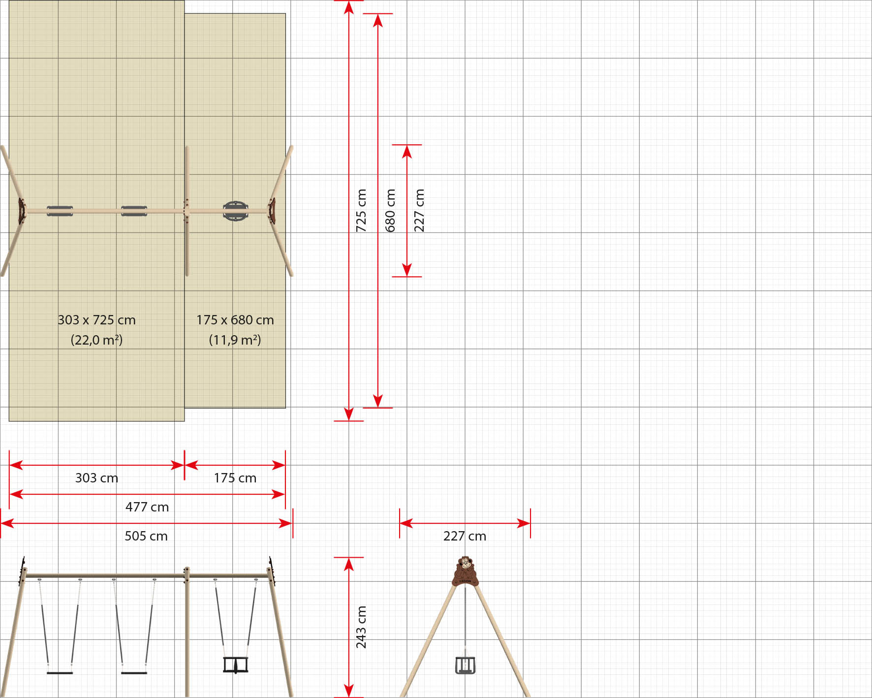 Målat modulärt gungstativ ur Explore-serien som möjliggör lek för många barn samtidigt. Kombinationen stödjer både små barns trygga gunglek och äldre barns motoriska utveckling.