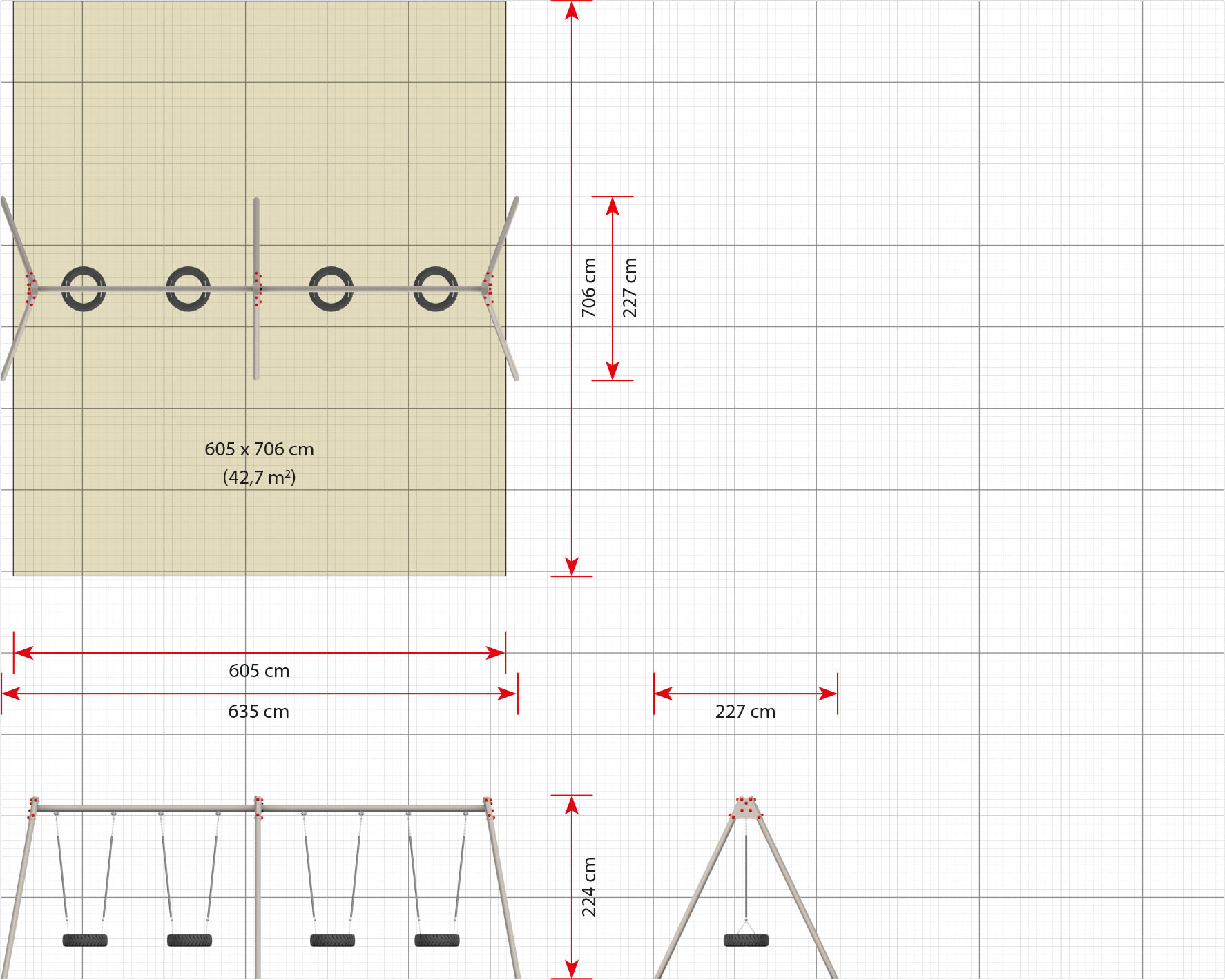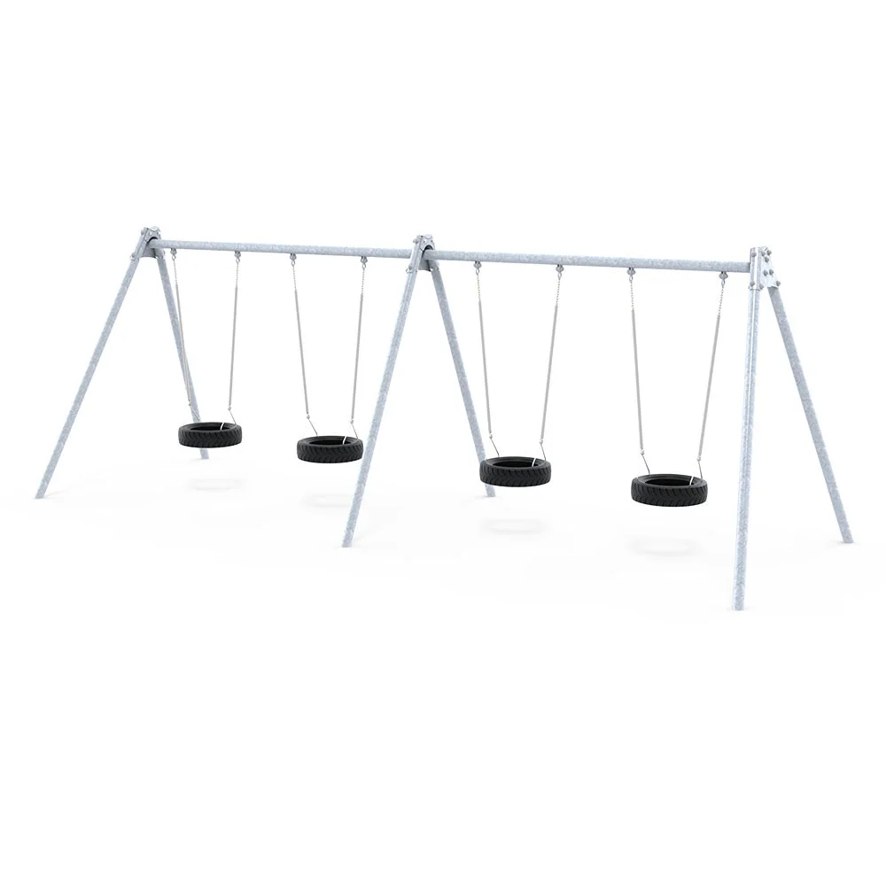 Moduluppbyggt gungstativ i metall som möjliggör samtidig lek för flera barn. De fyra däckgungorna passar en bred åldersgrupp och främjar balans, samspel och motorisk utveckling.