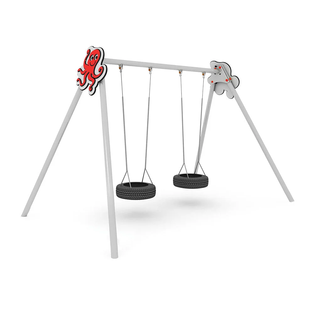 Gungstativ i metall med två däckgungor och dekorativa detaljer som stimulerar fantasi och kreativ lek. Däckgungorna passar en bred åldersgrupp och stödjer balans, koordination och social interaktion.