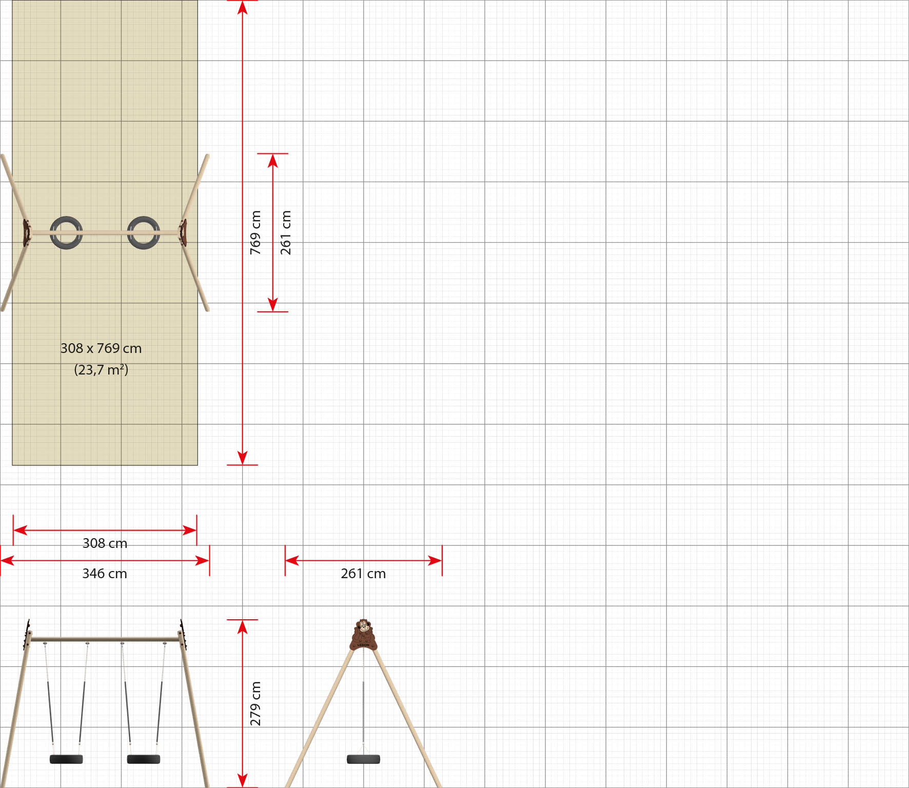 Målat gungstativ ur Explore-serien med två däckgungor och extra hög ram. Ger möjlighet till gemensam lek, balansutveckling och användning även av äldre barn och vuxna.