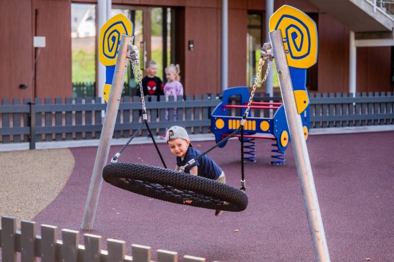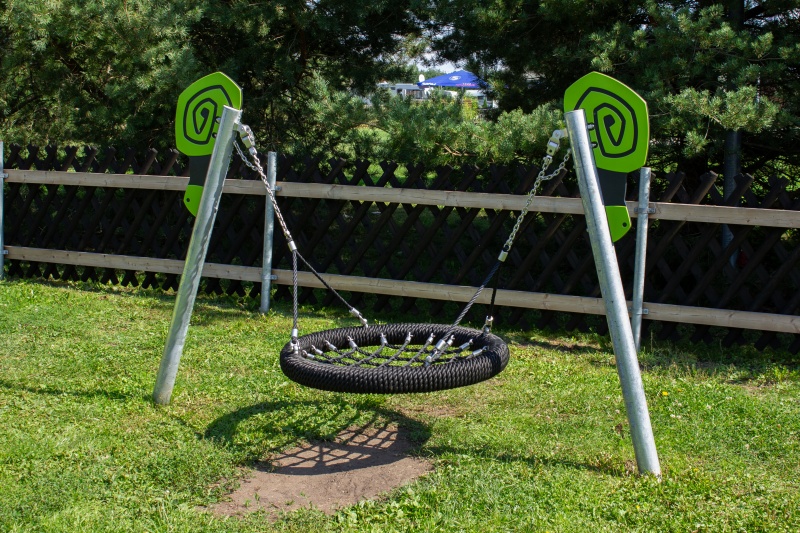 Enkelfacks gungställning i varmgalvaniserat stål, dekorerad med snigelmotiv. Anpassad för små barn och kan kompletteras med lämplig sits.
