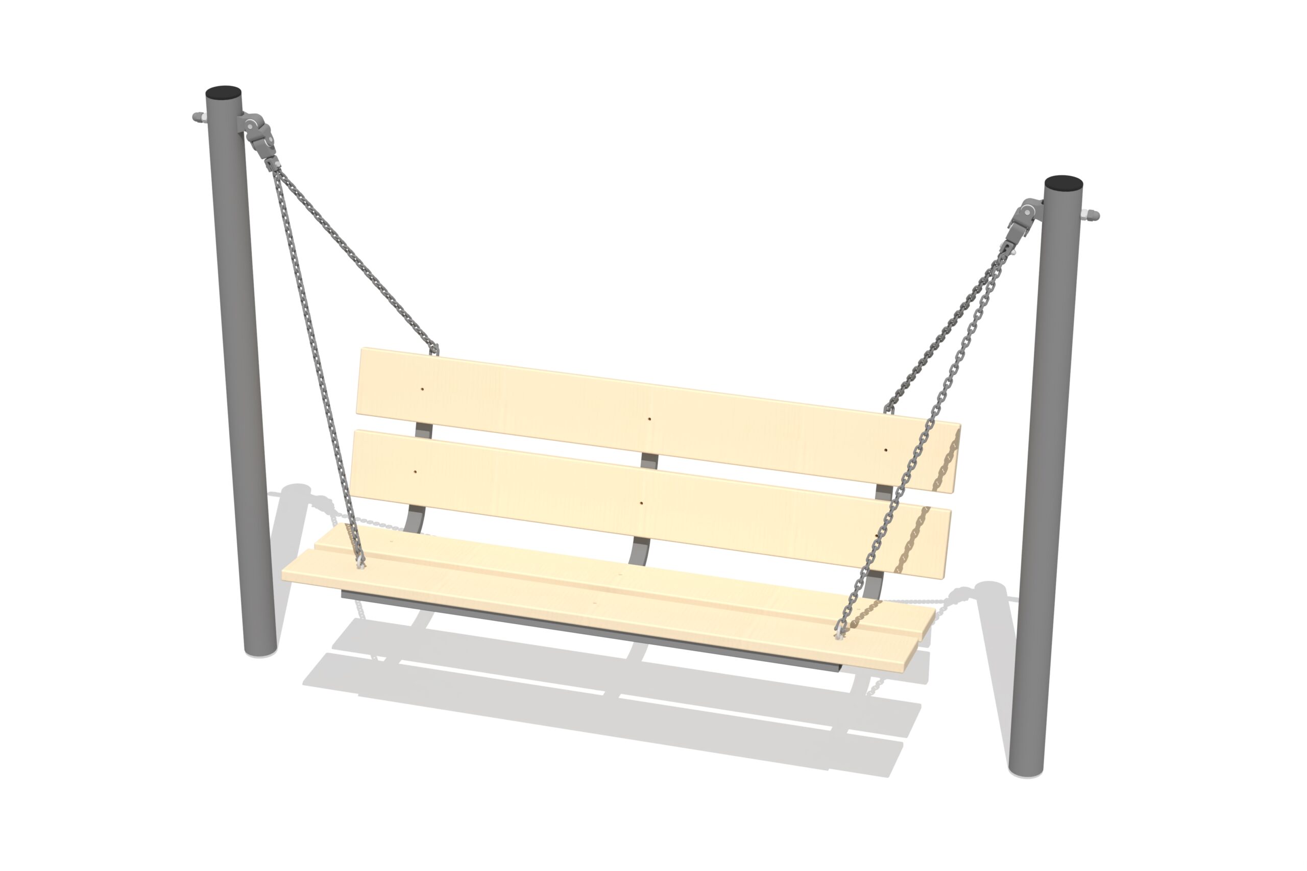 Gungställningsbänk med ryggstöd och stabil varmförzinkad metallkonstruktion. Sits i väderbeständigt laminerat trä. Avsedd för både barn och vuxna och förankras genom gjutning.