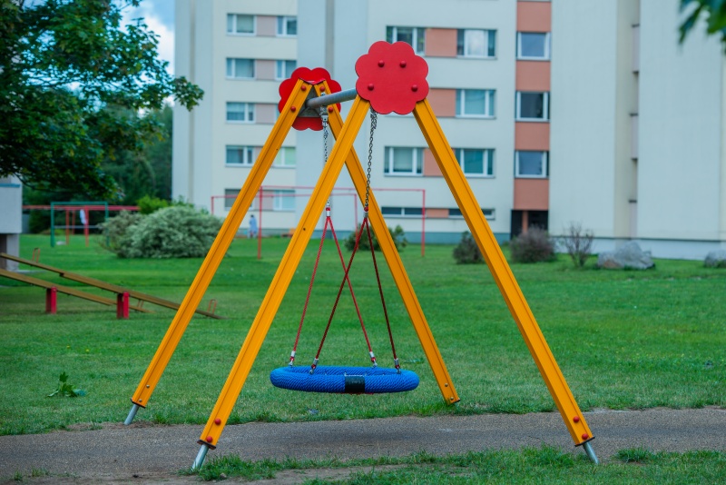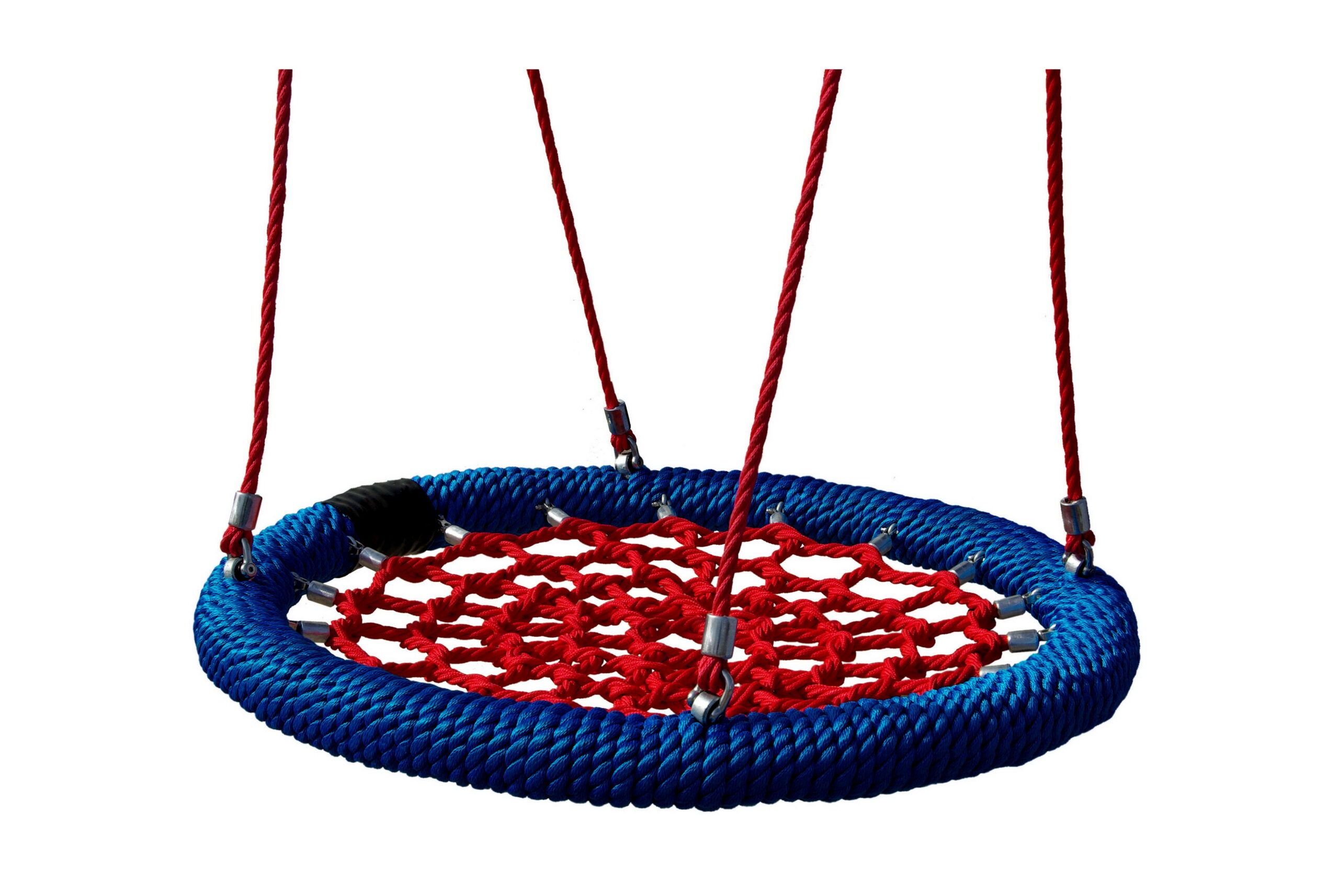 Gungsits i form av fågelbo med 1 meters diameter. Utrustad med stålkärna, PP-repskydd, säkerhetskedjor och kullagrade hängare i rostfritt stål. Lämplig för tvåsitsiga gungfack.