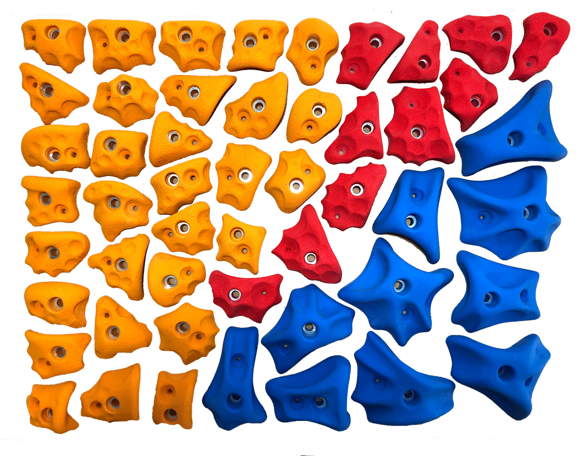 Gym 1 är ett paket med totalt 50 st. klättergrepp i tre olika färger och modeller. Greppsatsen innehåller både grepp som är lätta att klättra på för nybörjare och även grepp av lite tuffare typer. De monteras med insexbult (medföljer ej). Perfekta där man vill variera lederna på sin befintliga klättervägg eller vill bygga en egen klättervägg där man lätt kan variera leder och banor. Ett bra komplement t e x till Ergo Holds Basic 60! (osorterade färger)
