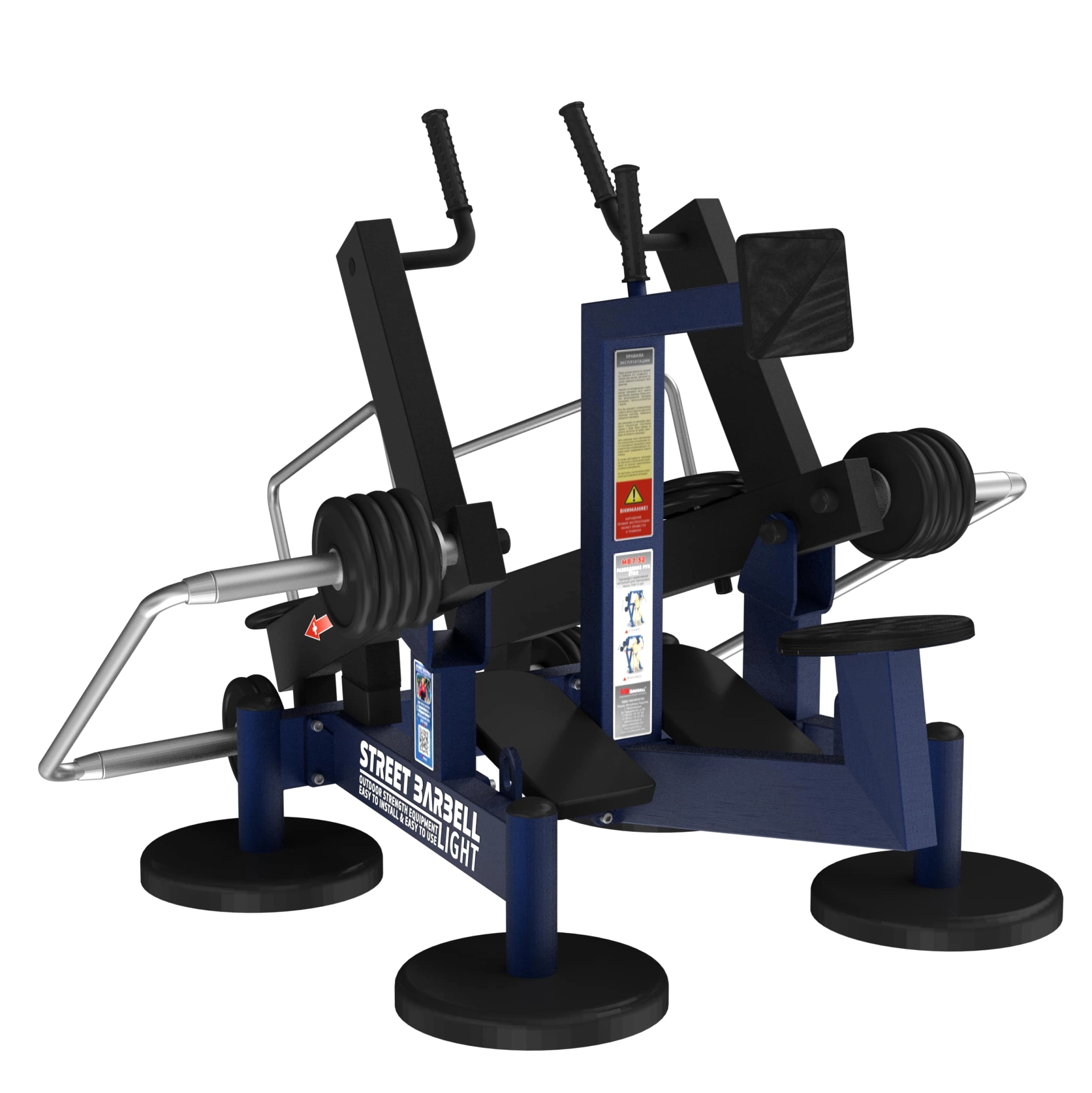 Stående Back Row-roddmaskin i stålprofil 120×80 mm med dubbellager pulverlackering. Handtag i återvunnen plast och ryggstöd i fenolbelagd plywood. Viktmotstånd via gummibelagt system på rostfria skenor med justering i 2,5 kg-steg. Förankras i betong och levereras med QR-kod för träningsinstruktion.