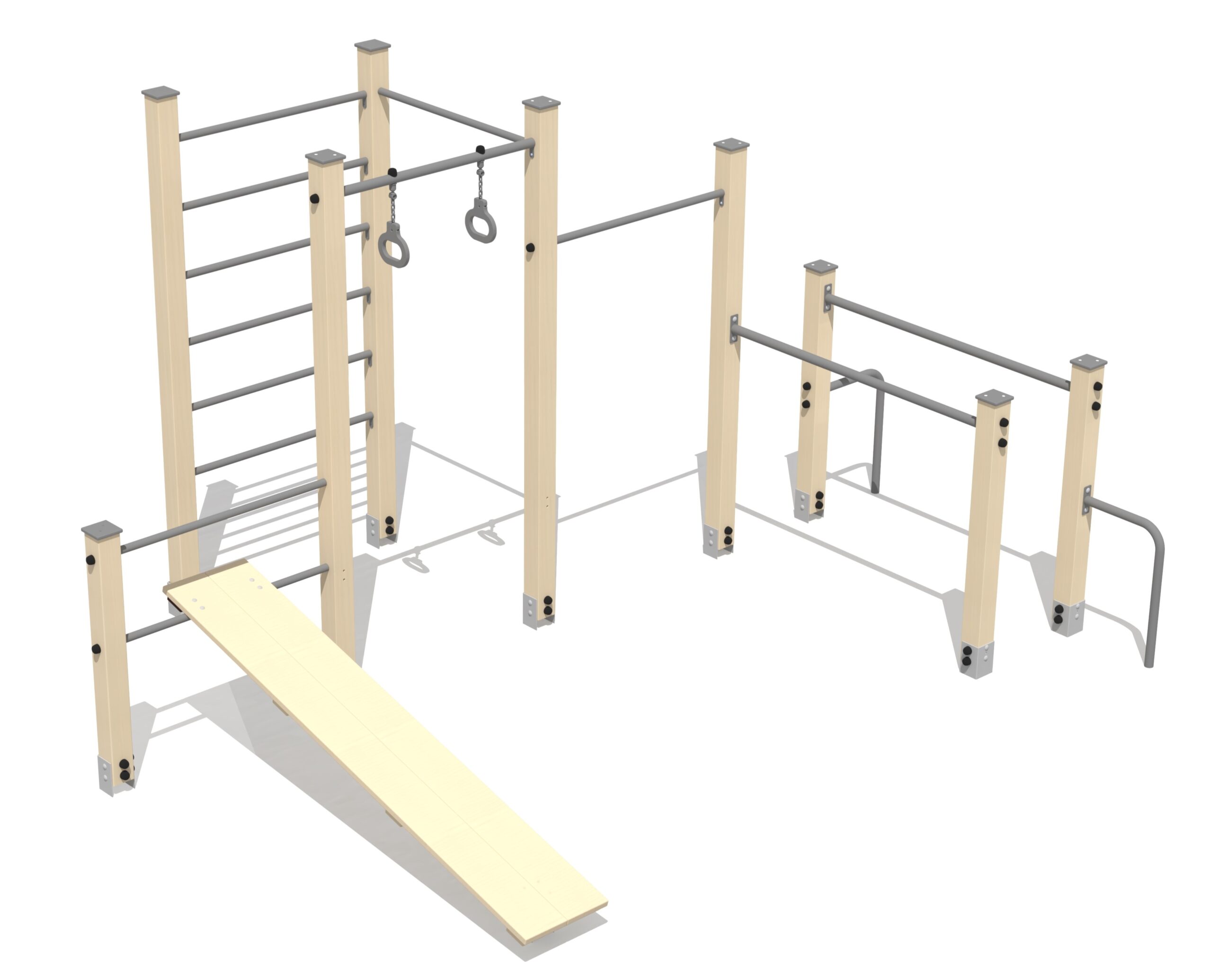 Detta kompakta träningskomplex utomhus består av parallella stänger, klätterstege, magträningsutrustning samt hängstång, inklusive en hängstång utrustad med hängande ringar. Passar för varierad och funktionell träning.