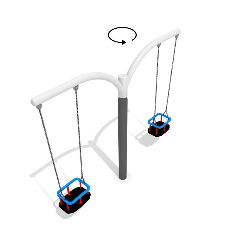 Solano 2–2 har två armar och två babyboxstolar upphängda i kedjor. Den övre delen roterar och ger en mjuk och kontrollerad snurrlek för små barn.