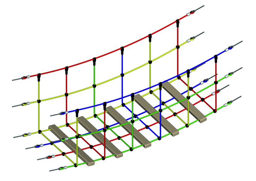Broplankorna i furu (750 × 50 × 75 mm) bildar en trygg men rörlig gångyta, medan sidor och upphängning består av 16 mm Taifunrep – känt för sin höga styrka, UV-stabilitet och vandalsäkra konstruktion. Repet har en stålkärna som ger maximal hållbarhet och lång livslängd även i offentlig miljö. Monteringen sker med M12 rostfria öglebult för extra stabilitet och säkerhet.