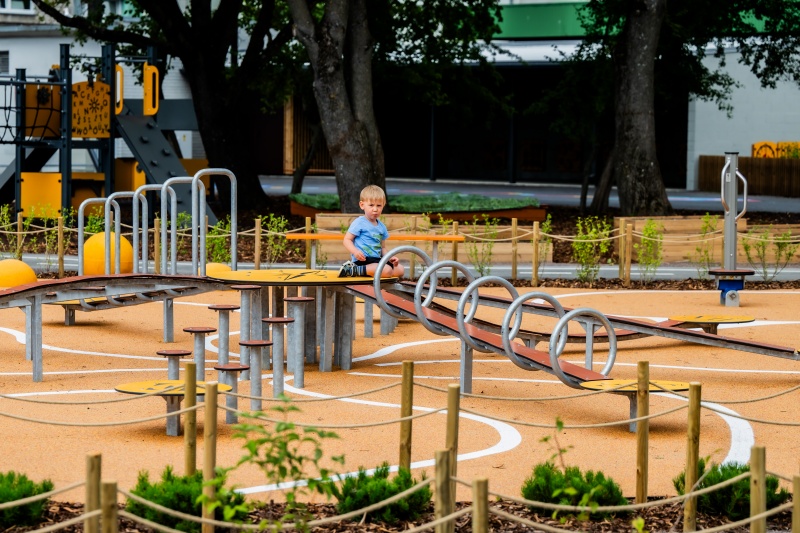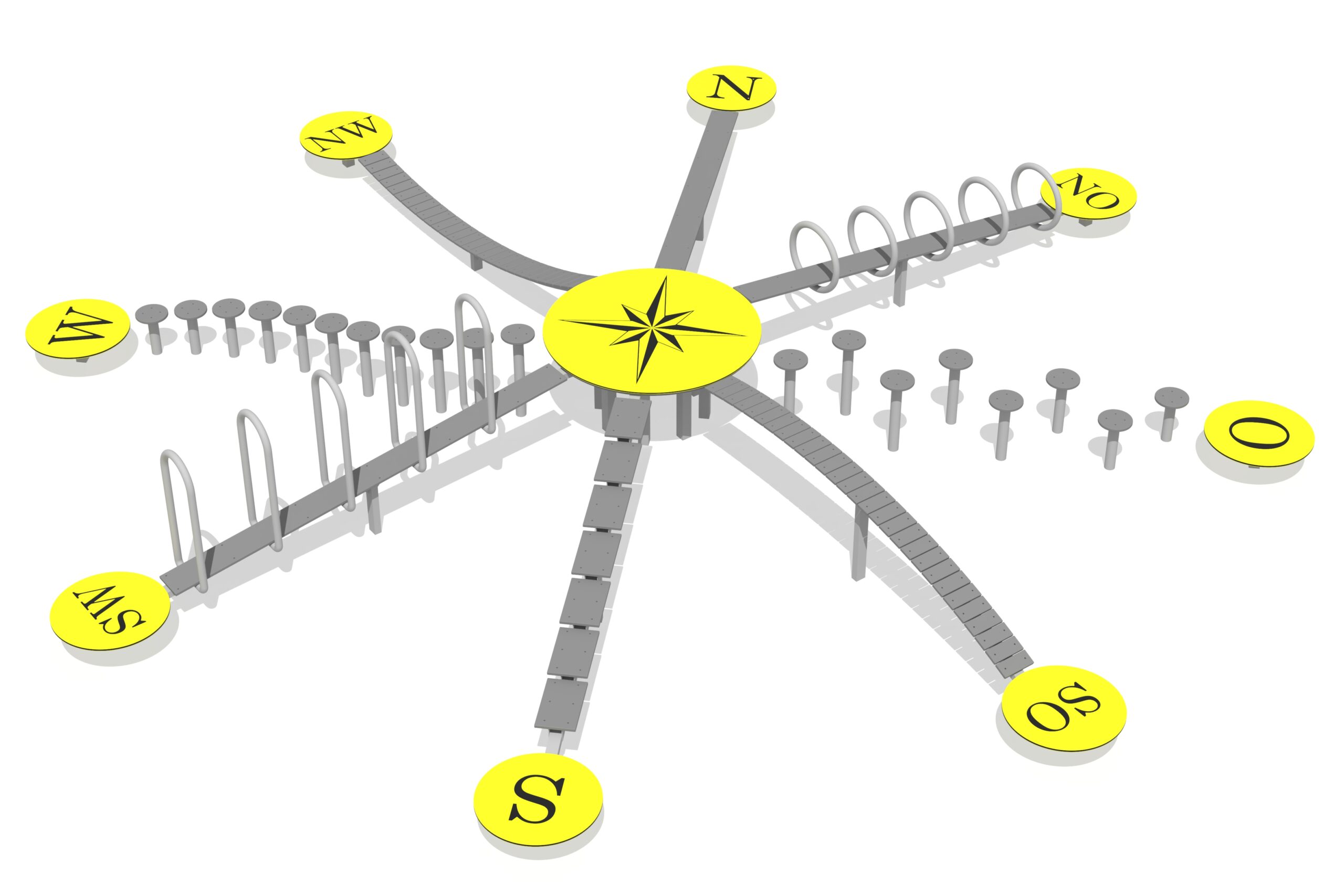 På balanseringsutrustningen Kompass tränar barn koordination och balans samtidigt som de lär sig kardinalriktningar. En initial som anger riktning är inristad i den första plattan på varje spår. Totalt finns åtta olika balans- och krypspår, där varje spår installeras i riktning mot motsvarande väderstreck. Bilderna är illustrativa. Bryggorna är tillverkade av gummibelagd HDPE med halkskyddsplast.