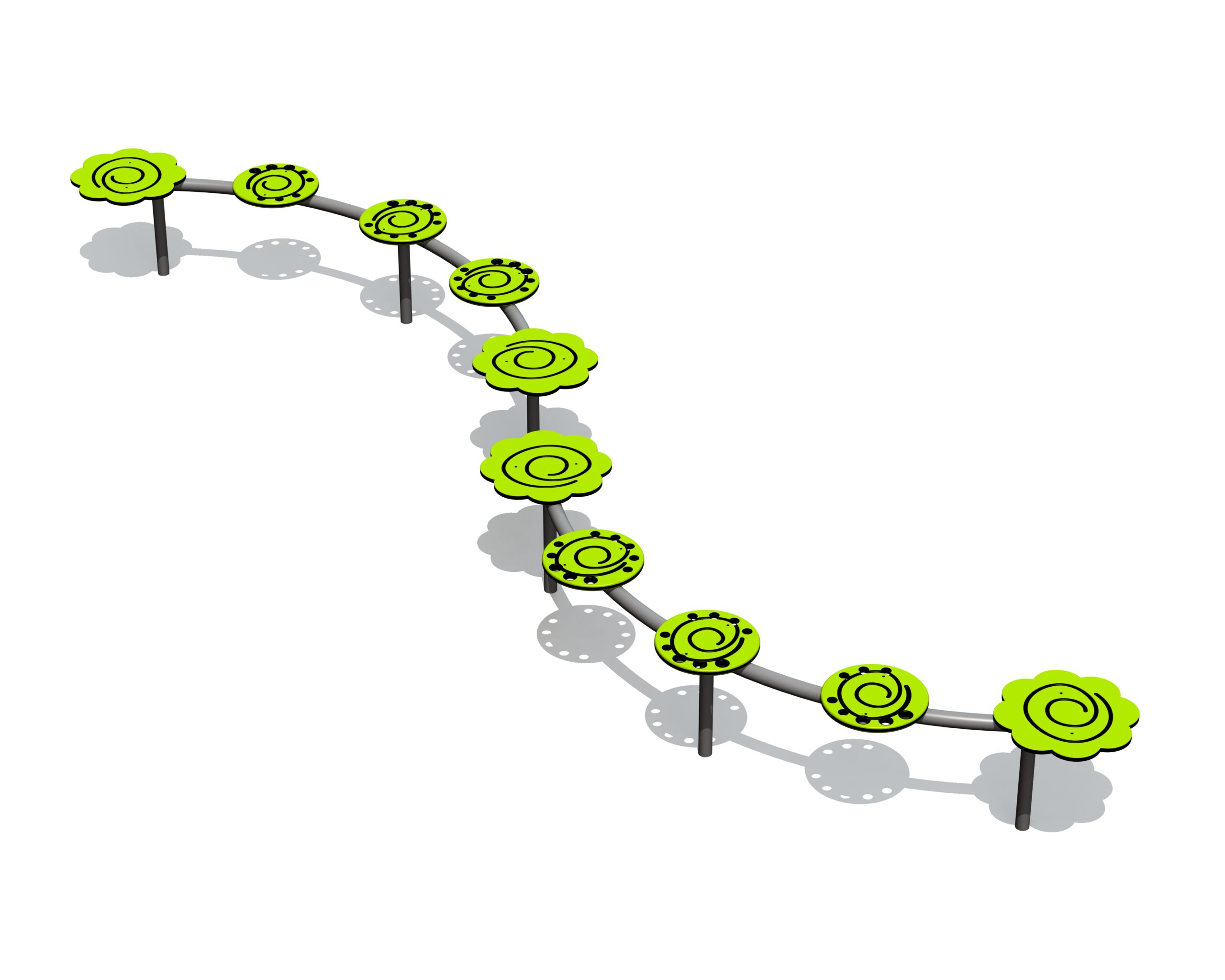 Spiralbalken med färgade skivor tränar balans och koordination. Skivorna kan även användas som sittplatser och innehåller hål som hjälper barn att lära sig siffror.
