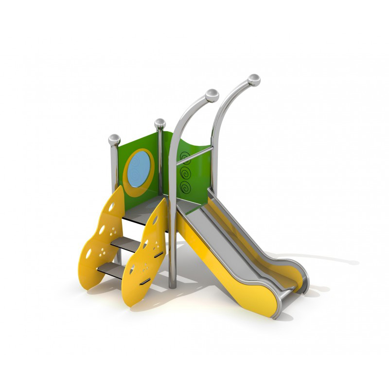 Lekutrustning i rostfritt stål med rutschkana, HDPE-väggar och halkskyddat HPL-golv. Konstruktionen är svetsad utan klämmor och mycket väderbeständig. Uppfyller EN 1176 och är avsedd för barn 1–5 år. Finns även i galvaniserad och pulverlackerad version.