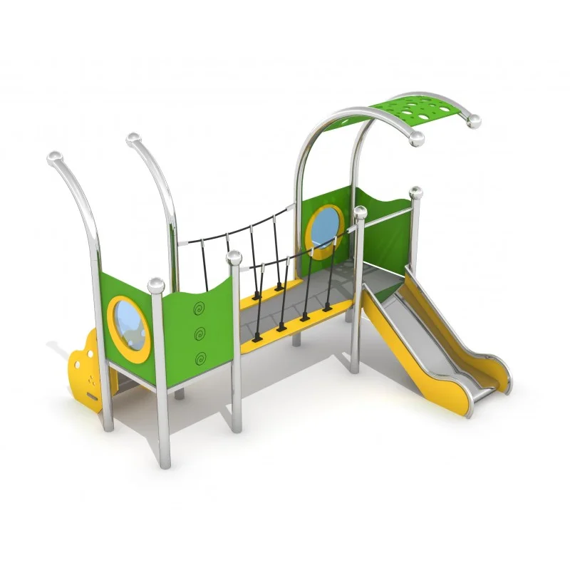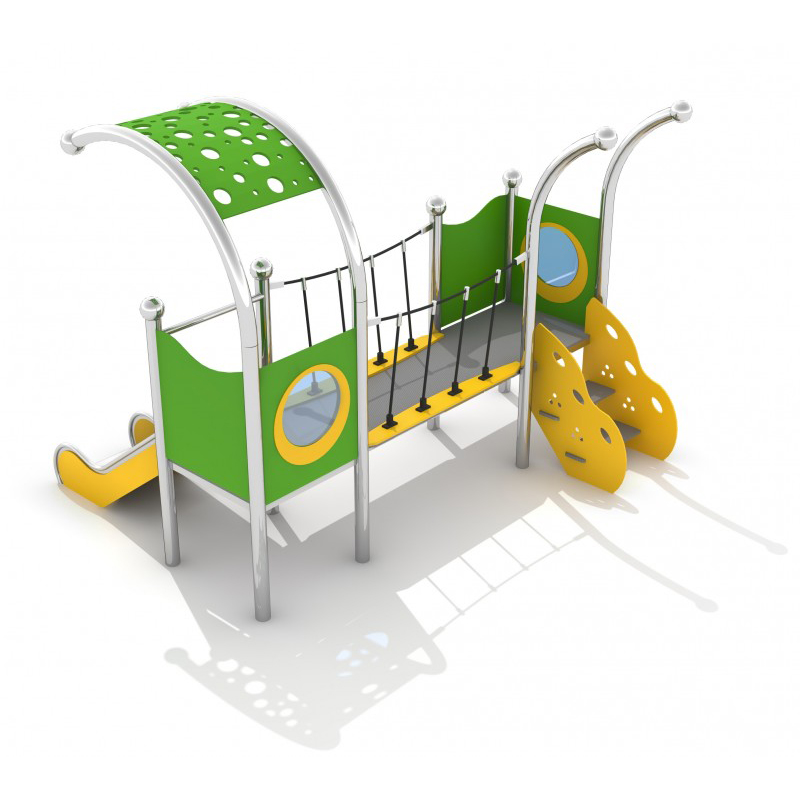 Lekutrustning i rostfritt stål med två torn, rutschkana och bro. Väggar och balustrader av HDPE, golv av halkskyddad HPL. Svetsad konstruktion utan klämmor. Uppfyller EN 1176. Avsedd för barn 1–5 år. Finns även i galvaniserad och pulverlackerad version.