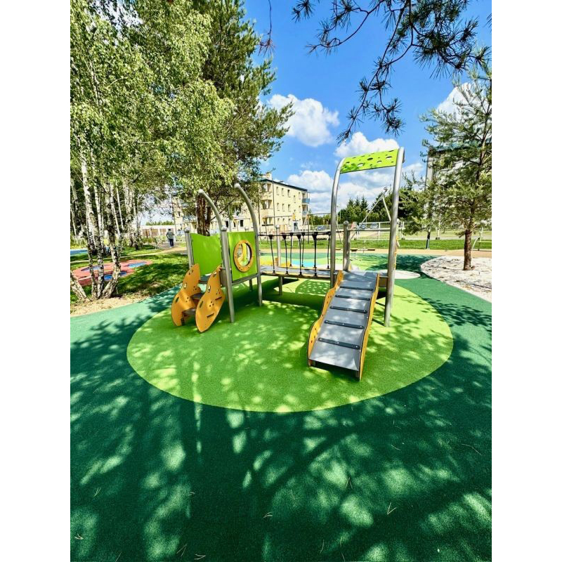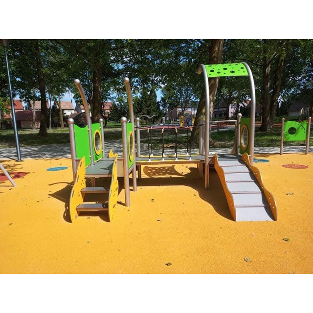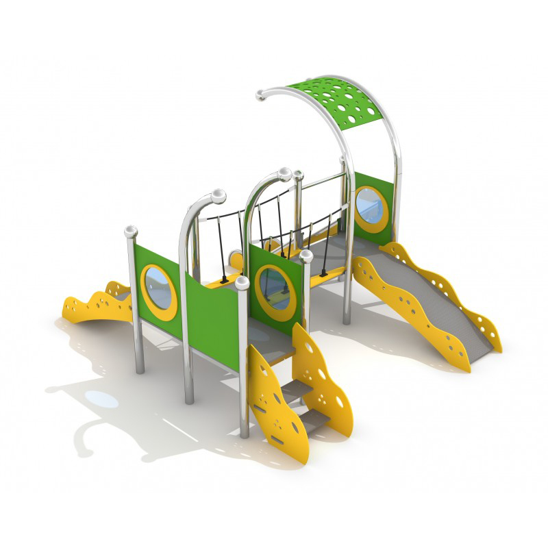 Lekutrustning i rostfritt stål med två torn, rutschkana, bro och entrégångar. HDPE-väggar och halkskyddat HPL-golv. Svetsad konstruktion utan klämmor. Uppfyller EN 1176. Avsedd för barn 1–5 år. Finns även i galvaniserad och pulverlackerad version.