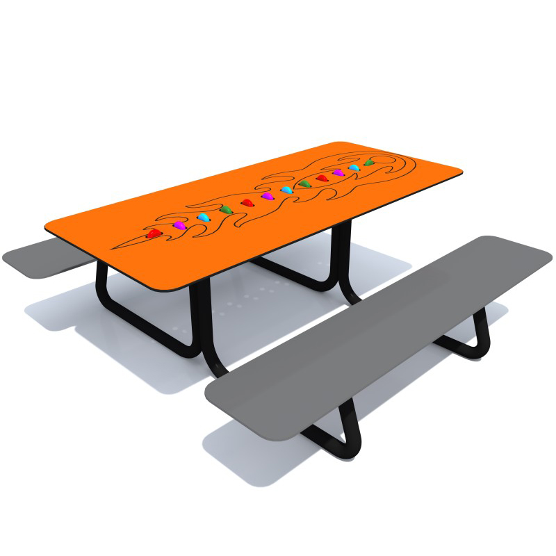 Aktivitetsbord designat för kreativ lek för äldre barn och anpassat för rullstolsanvändare. Bordet har roterande hjul som avger färgstarka ljuseffekter vid rörelse. Konstruktionen är tillverkad av galvaniserat och pulverlackerat svart stål. Bordsskiva och bänkar är gjorda av slitstarkt HPL-material.