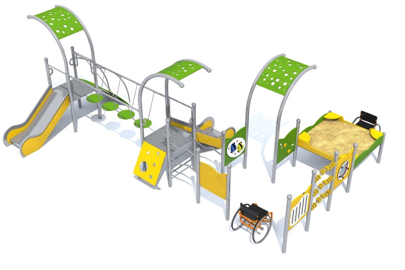 Omfattande integrerat lekset med två torn, tre rutschkanor, broar, klätterväggar och flera sensoriska paneler. Utformat för aktiv, kreativ och inkluderande lek. Konstruktionen är svetsad i rostfritt stål med dekorativa detaljer. Golvet är tillverkat av halkfri HPL för trygg användning i alla väder.