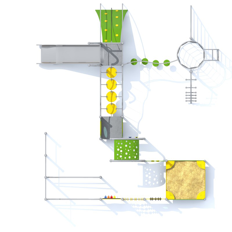 Lekställning med två torn, rutschkanor, broar, ramper, stegar och sensoriska paneler med ljud och rörelse. Konstruktionen är svetsad i rostfritt stål utan klämmor. Väggar och ramper i HDPE samt golv i halksäker HPL.