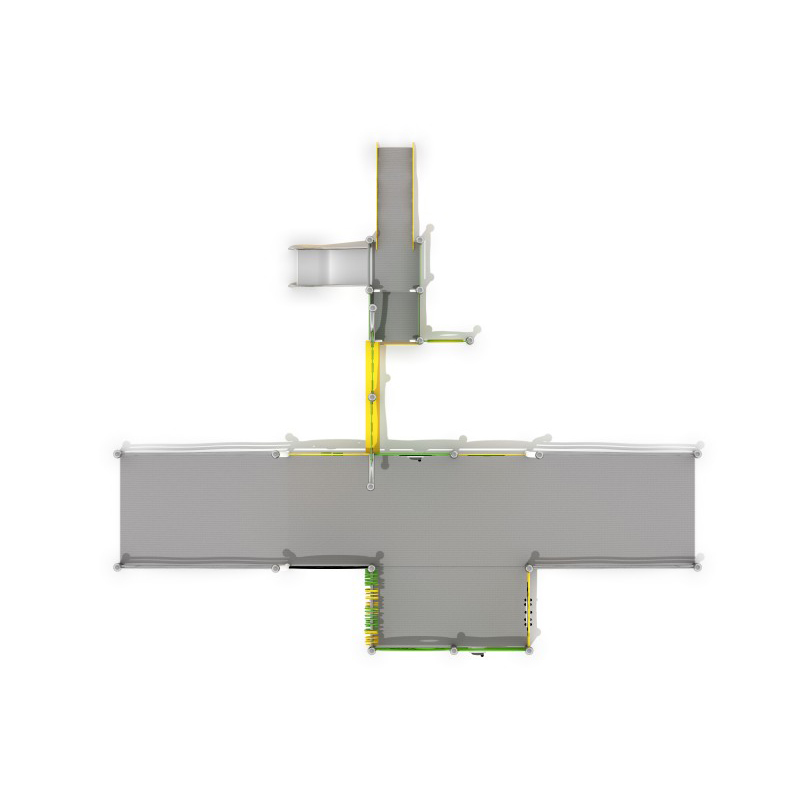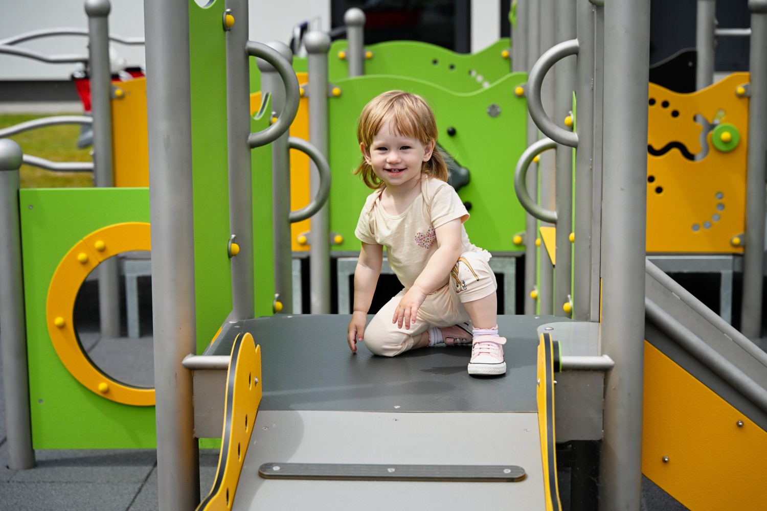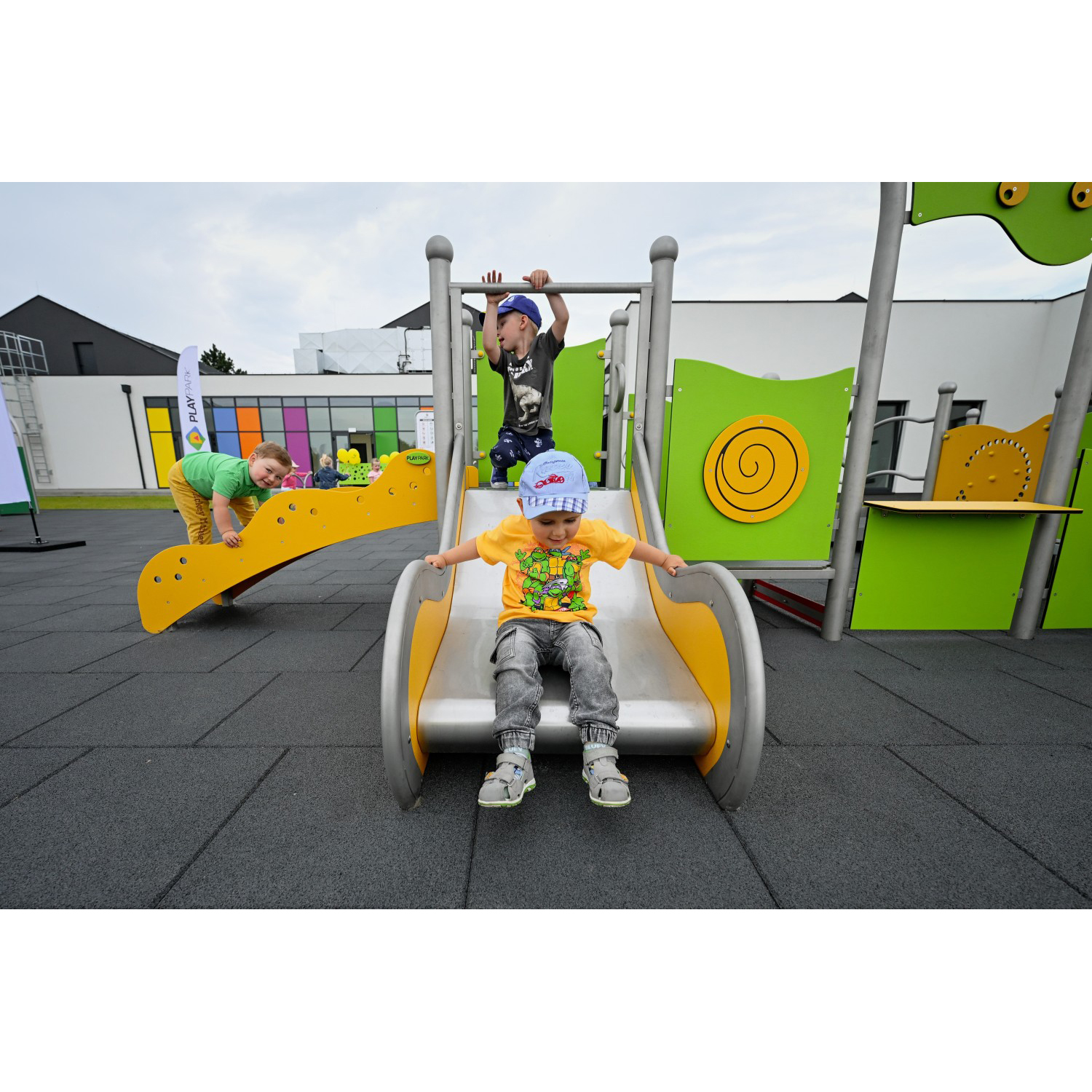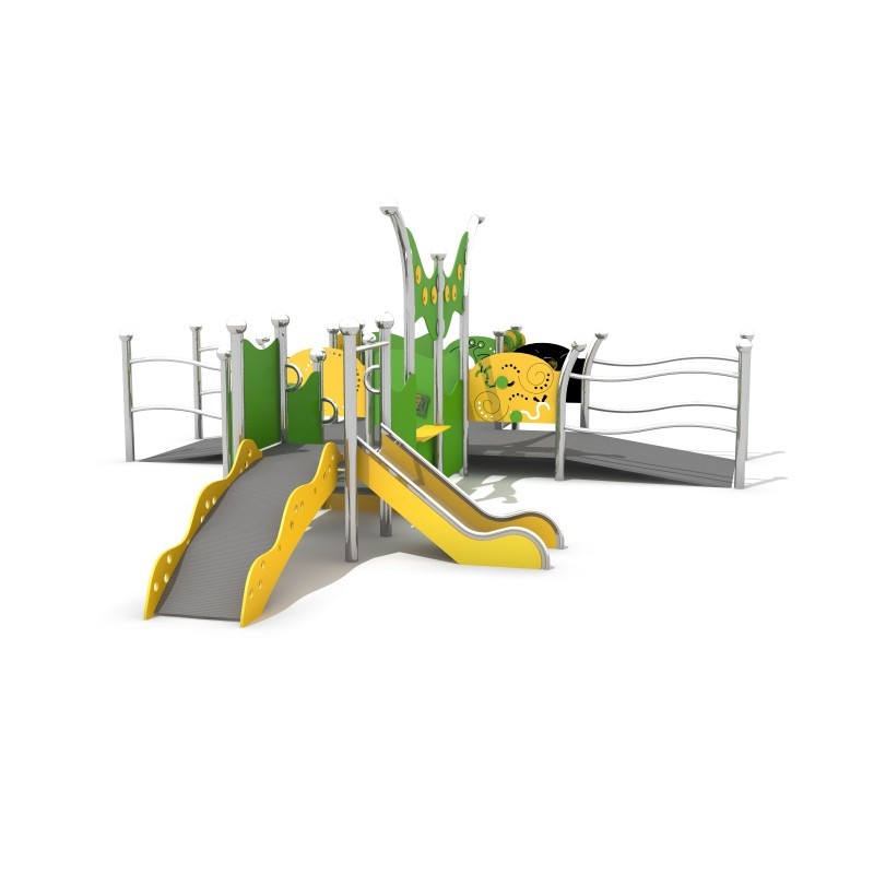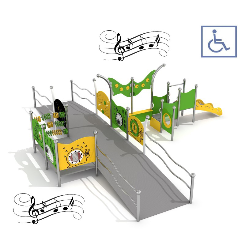 Multifunktionell lekställning anpassad för rullstolsburna barn. Konstruktionen är tillverkad av rostfritt stål och utrustad med musikpaneler i färgerna gult och grönt. Utformad för tillgänglig, social och stimulerande lek.