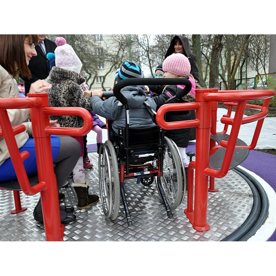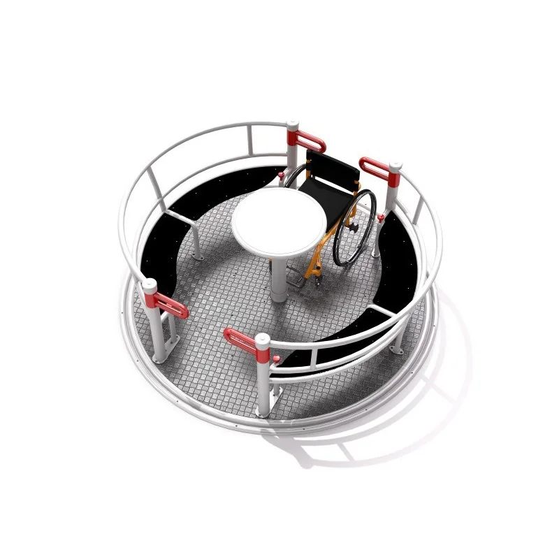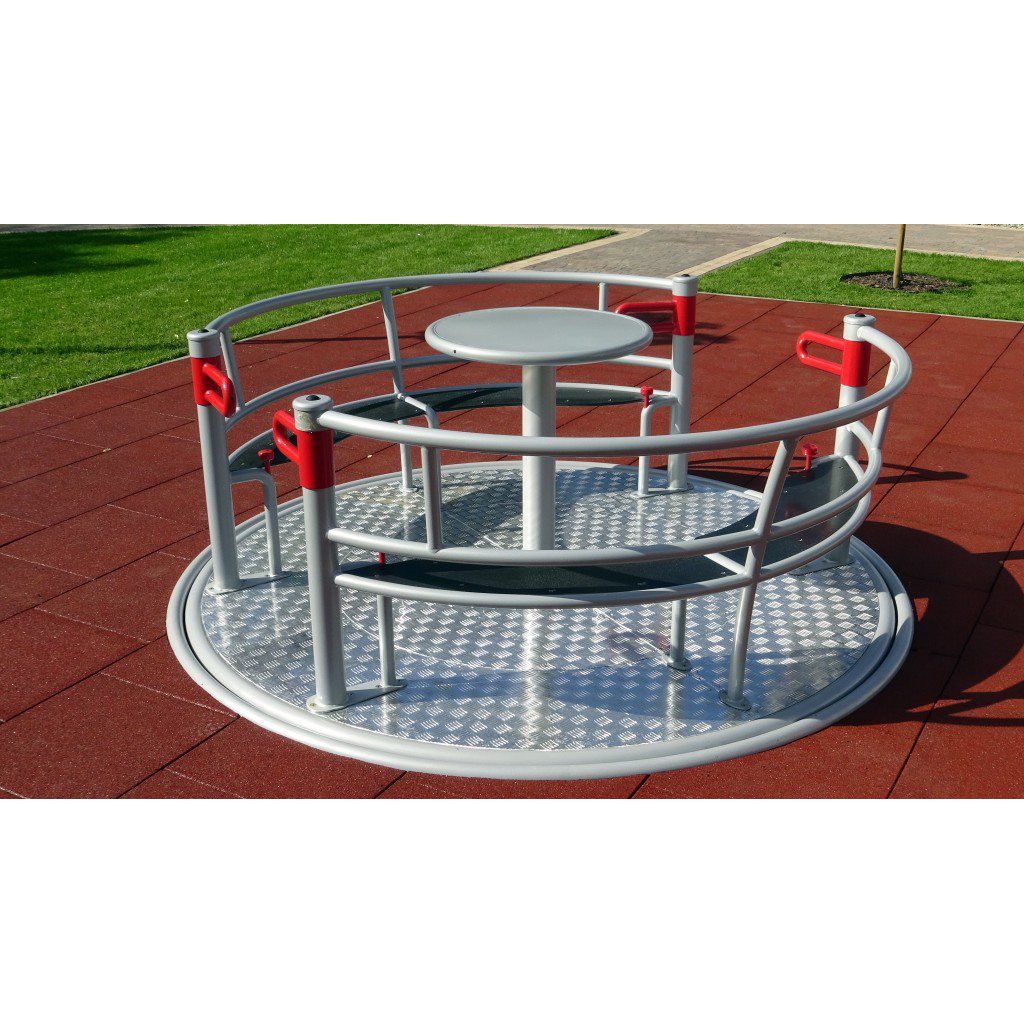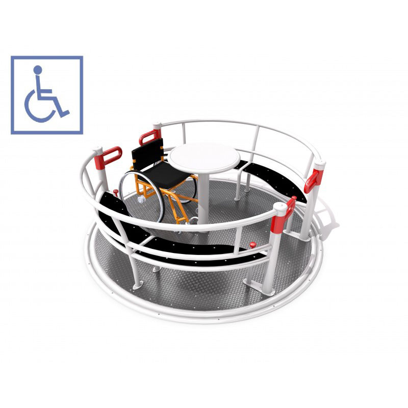 Inkluderande rondell som möjliggör samtidig användning av två personer i rullstol och fyra personer på bänkar. Utrustad med säkerhetssystemet INTEGRADO som låser rotation vid öppna portar, bromsar överhastighet och stoppar enheten om grind öppnas under drift. Rondellen styrs via en central ring och har två grindar samt internt skyddssystem för säker användning.