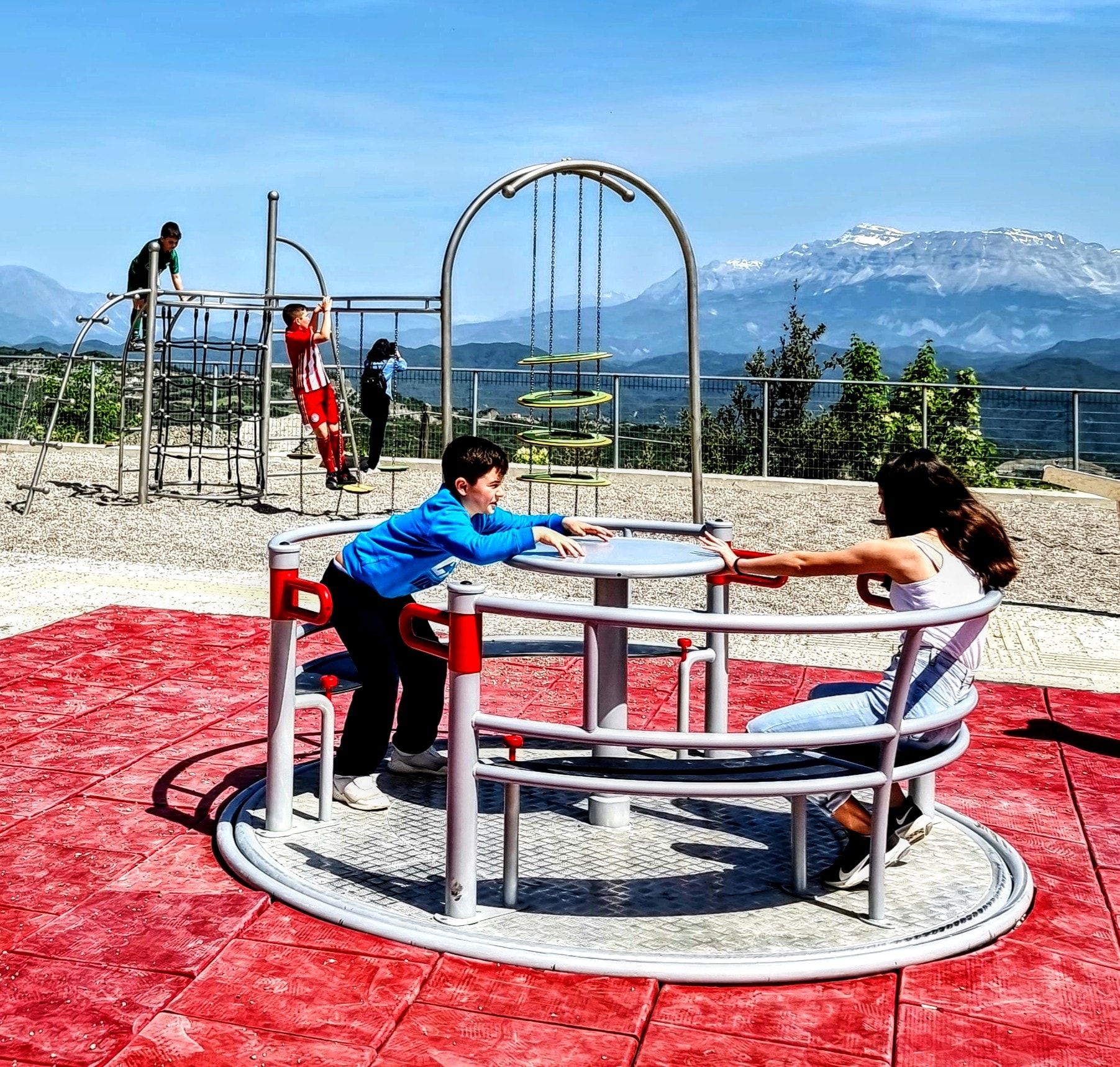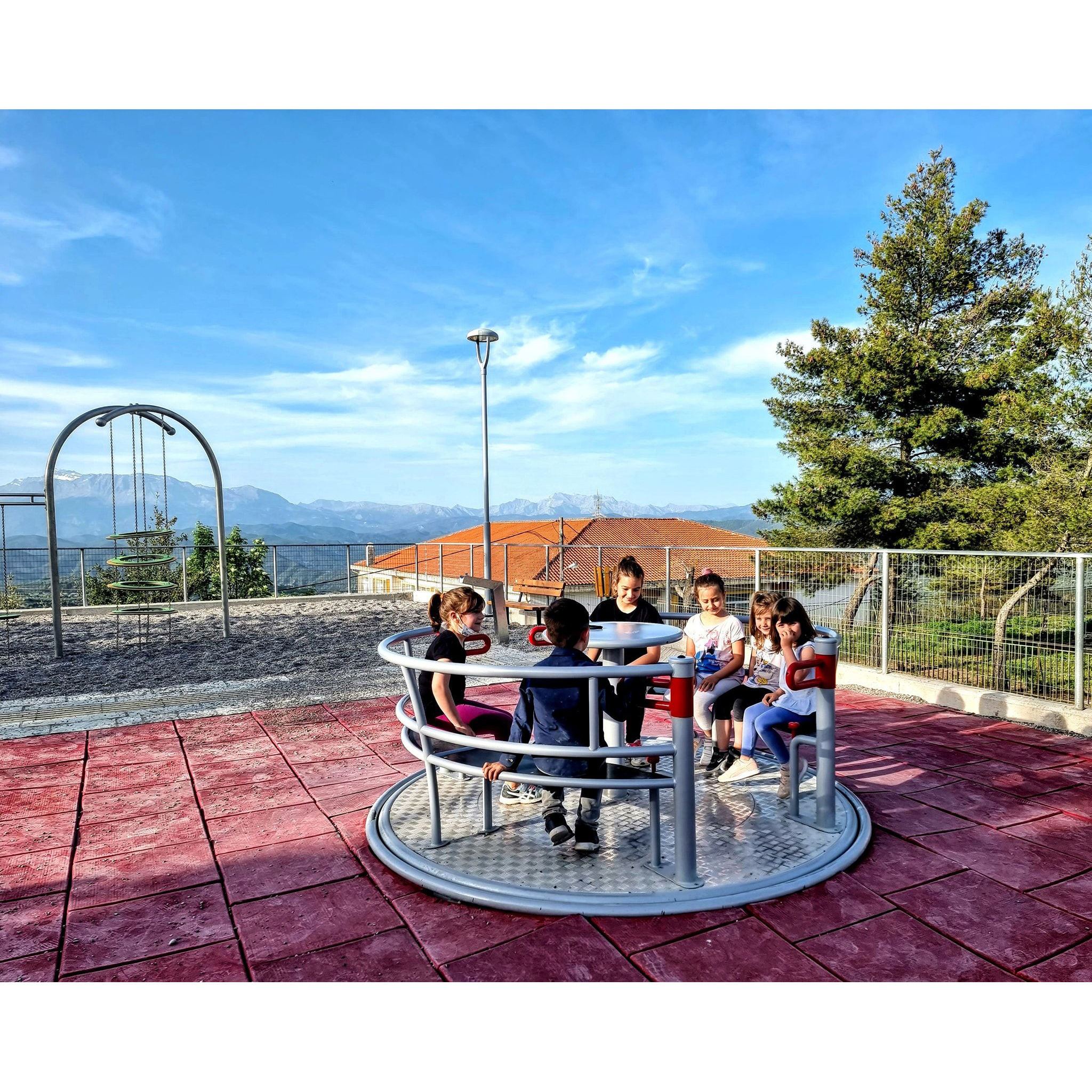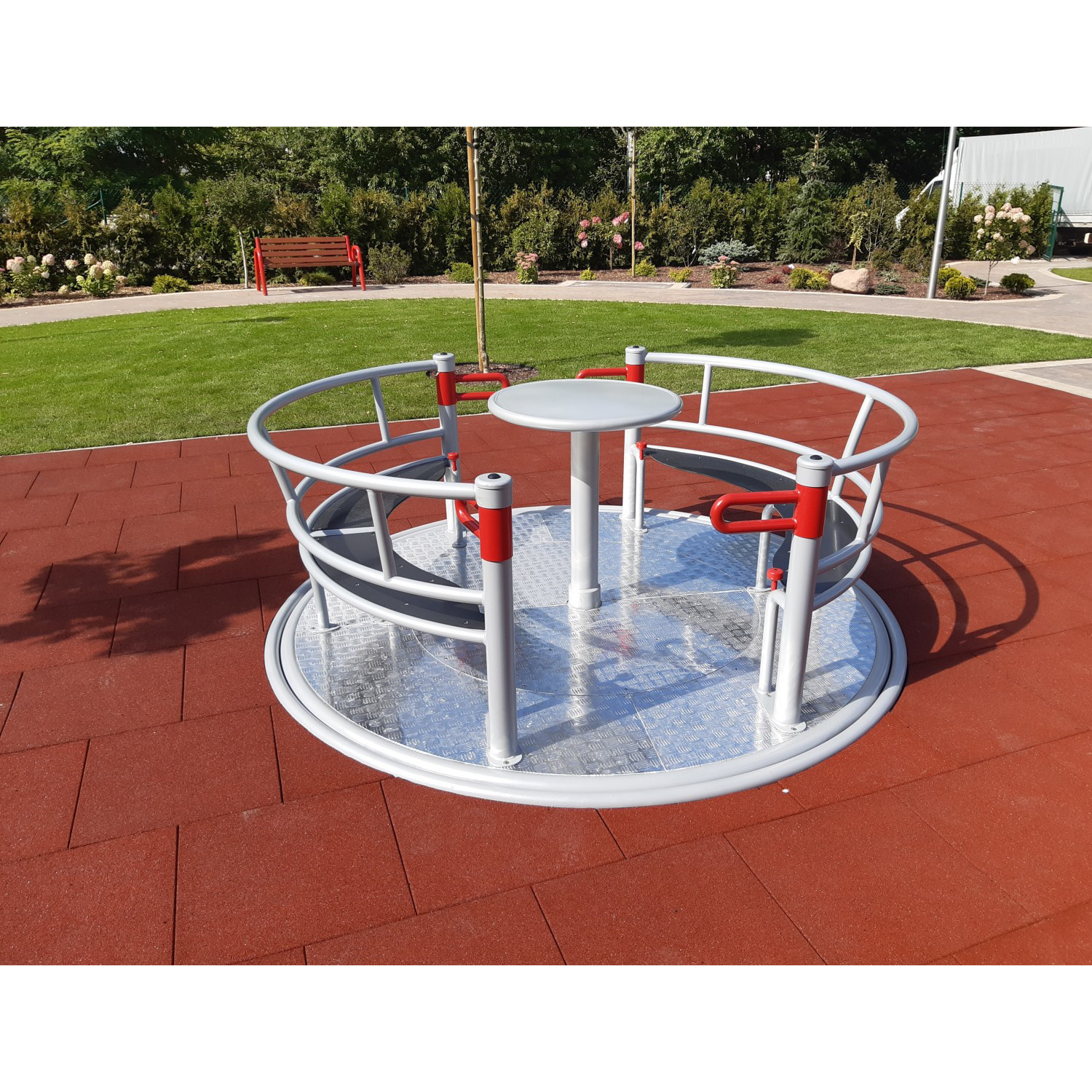 Inkluderande rondell som möjliggör samtidig användning av två personer i rullstol och fyra personer på bänkar. Utrustad med säkerhetssystemet INTEGRADO som låser rotation vid öppna portar, bromsar överhastighet och stoppar enheten om grind öppnas under drift. Rondellen styrs via en central ring och har två grindar samt internt skyddssystem för säker användning.