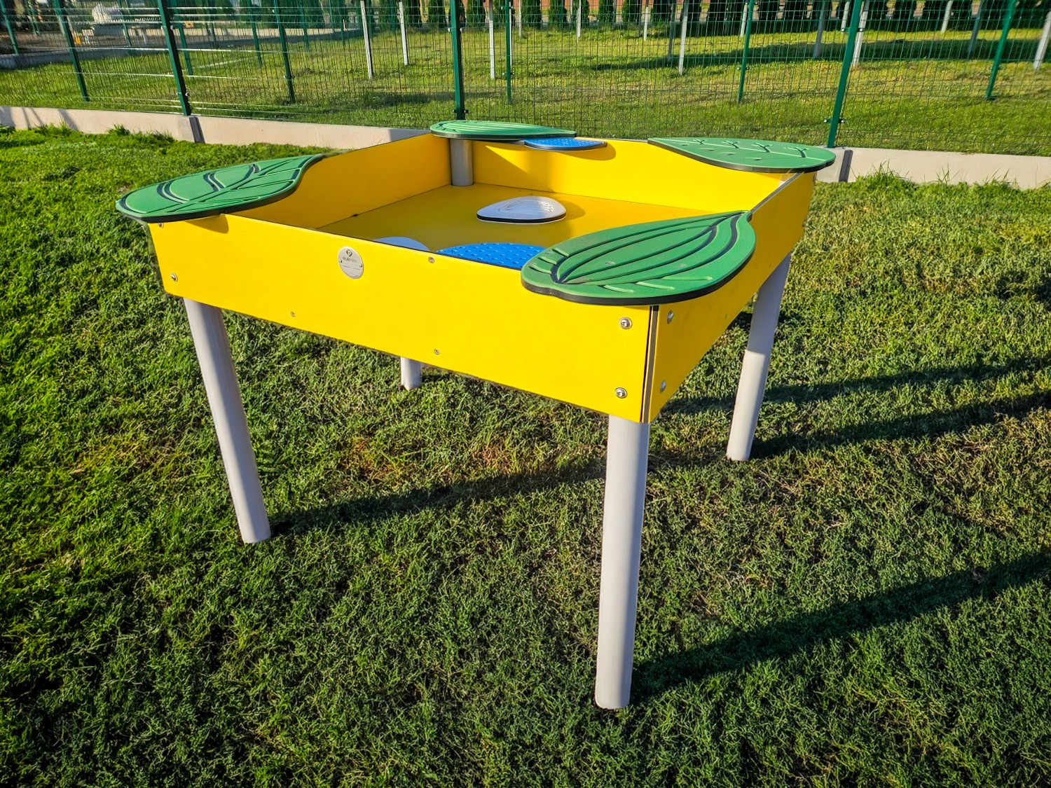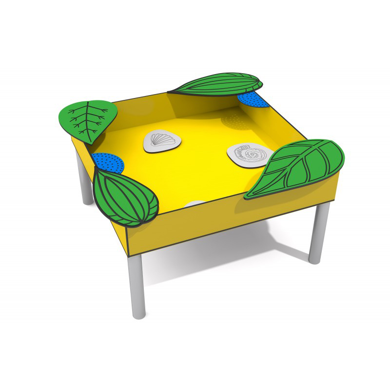 Fyrkantig sandlåda med praktiska toppar för att forma sandpajer och använda silar för sandsiktning. Anpassad för barn i rullstol. I botten finns dekorativa element som imiterar fossiler såsom snäckor och ben. Konstruktionen är tillverkad av pulverlackerat galvaniserat stål, anpassad för intensiv användning och utomhusmiljö. Sandlådans hölje och dekorativa detaljer är gjorda av HDPE.