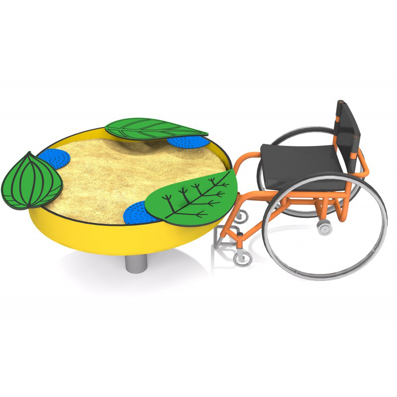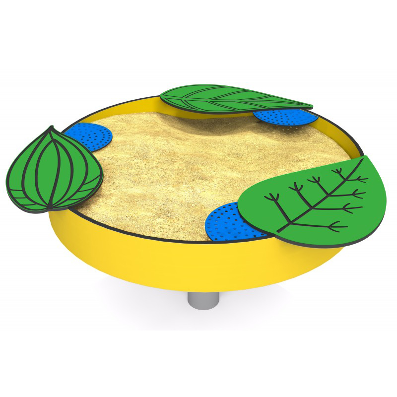 Rundformad sandlåda med toppar för formning och sandsiktning. Anpassad för användning av barn i rullstol. I botten finns dekorativa fossilelement som snäckor och ben. Konstruktionen är tillverkad av pulverlackerat galvaniserat stål med hölje och dekordetaljer i HDPE.