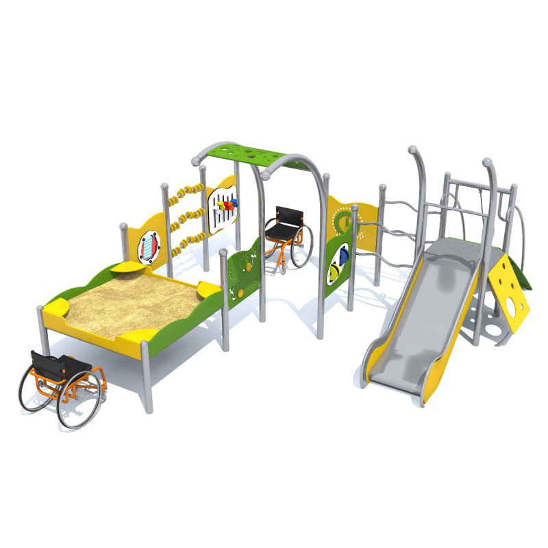 Integrerat sensoriskt lekset som innehåller torn, rutschkana, ramp, klättervägg, ljudpaneler, kulram och sandlåda. Utformat för att stimulera flera sinnen samt motorisk utveckling. Konstruktionen är svetsad i rostfritt stål utan klämmor. Golvet är tillverkat av halkfri HPL som varken överhettas eller fryser, vilket möjliggör säker lek året runt.