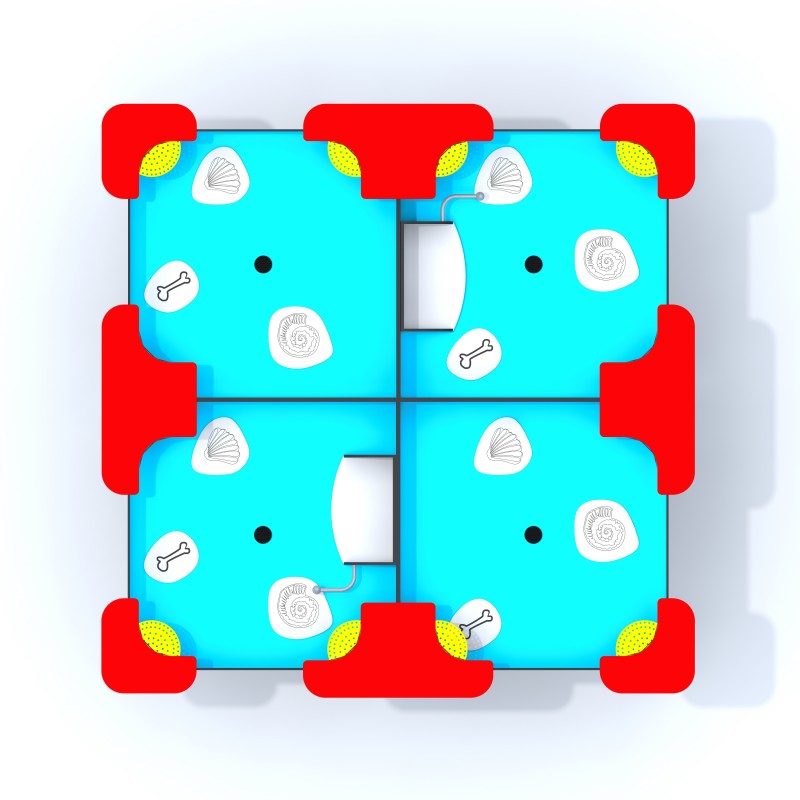 Fyrdubbel kvadratisk sensorisk sandlåda anpassad för barn i rullstol. Utrustad med toppar för sandkakor, silar och handtag för att hälla sand. Fossilliknande element som snäckor och ben finns i botten. Vattenuttag är installerade i mitten för enkel rengöring. Konstruktionen är tillverkad av pulverlackerat galvaniserat stål med sidoväggar i HDPE och handtag i rostfritt stål.