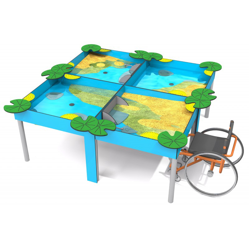 Fyrdubbel sensorisk sandlåda designad för kreativ lek med sand och vatten, anpassad för användning av barn i rullstol. Den fyrdubbelkvadratiska sandlådan är utrustad med bladformade toppar för sandkakor och silar samt handtag för att hälla sand. I botten finns dekorativa fossilliknande element såsom snäckor eller ben. Vattenuttag installerade i mitten gör rengöring enkel efter lek. Konstruktionen är gjord av pulverlackerat galvaniserat stål, motståndskraftigt mot väder och intensiv användning. Sidoväggar och dekorativa element är tillverkade av HDPE-platta. Handtag för sandhällning är tillverkade i rostfritt stål.
