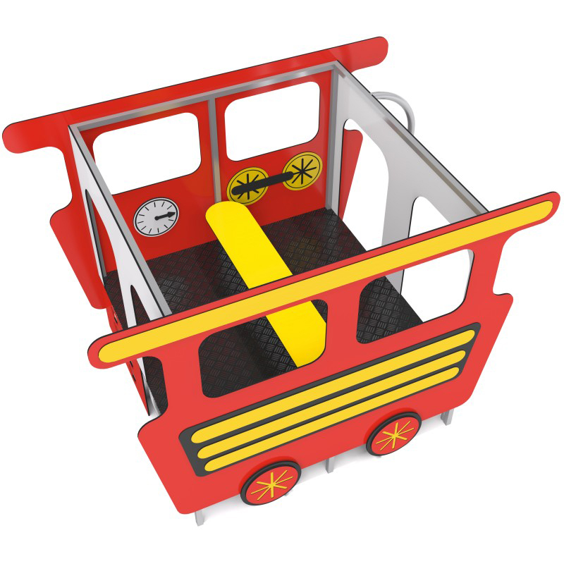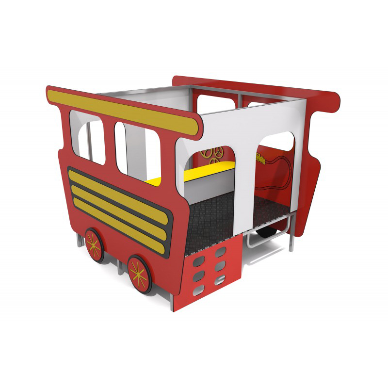 Lekplats som ser ut som en stor järnvägsvagn med två separata fack åtskilda av en vägg med runt fönster. Stommen är av galvaniserat och pulverlackerat stål. Väggarna är gjorda av HPL-skiva med dekorativa HDPE-detaljer. Golvet består av halksäker HPL-plåt.